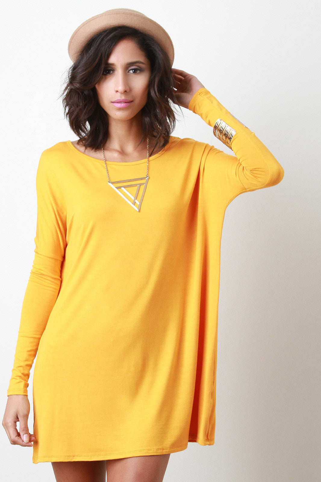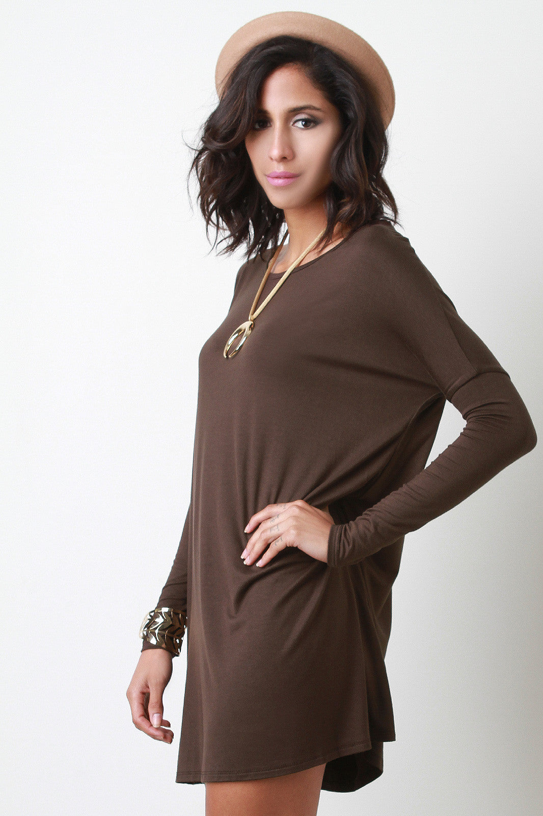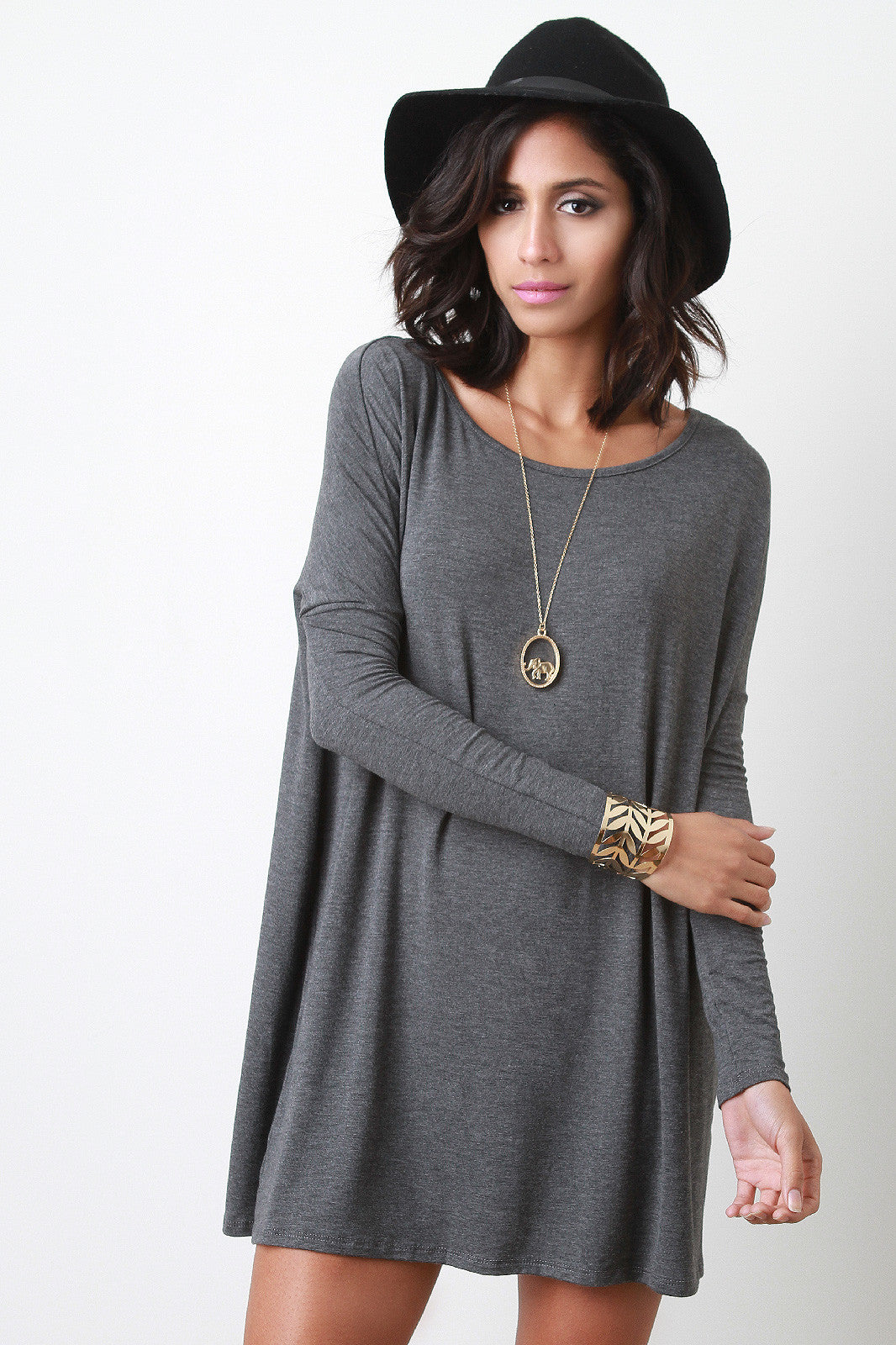 This jersey knit dress features a round neckline, long sleeves, boxy cut fit, and mini hemline. Accessories sold separately. Made in U.S.A. 95% Rayon, 5% Spandex.