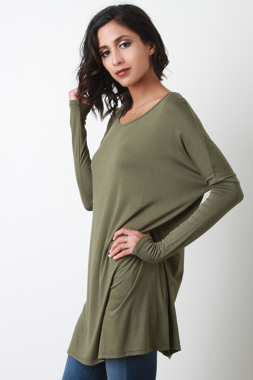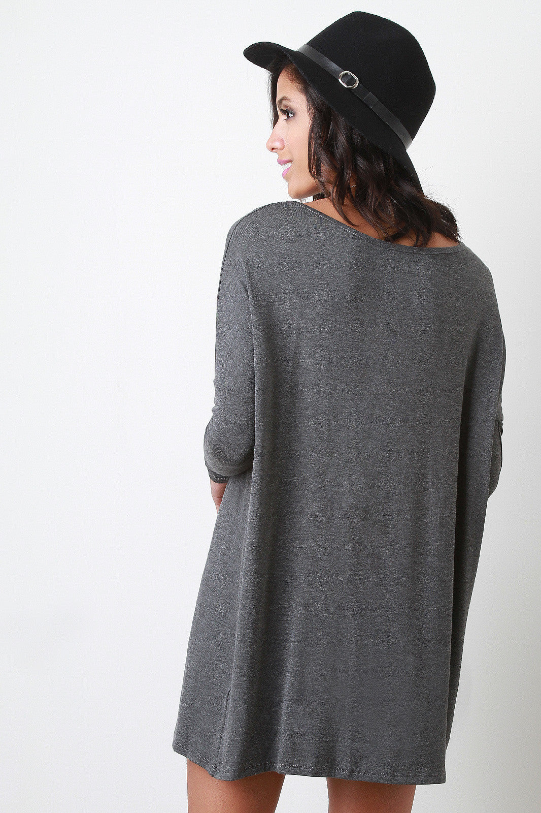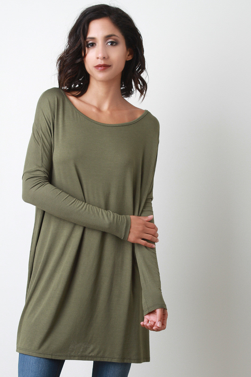 This jersey knit dress features a round neckline, long sleeves, boxy cut fit, and mini hemline. Accessories sold separately. Made in U.S.A. 95% Rayon, 5% Spandex.