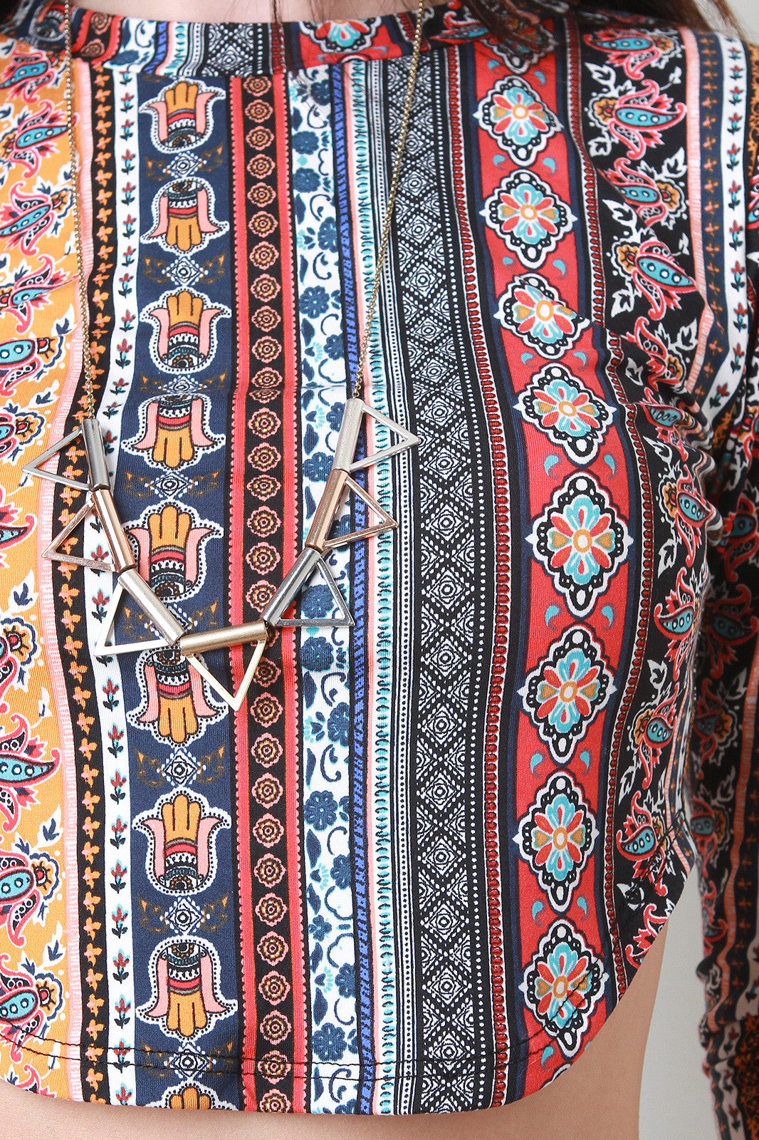 This top features a round neckline, quarter-length sleeves, round hemline with a higher crop design back, and finished with vertical Hamsa Boho pattern print. Accessories sold separately. Made in U.S.A. 100% Rayon.