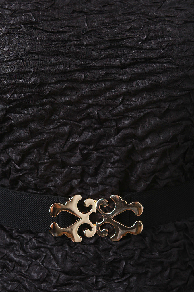 This lovely plus size bodycon dress features a crinkled fabrication, round neckline, long sleeves, belted waist, and asymmetrical hemline. Accessories sold separately. Made in U.S.A. 97% Polyester, 3% Spandex.