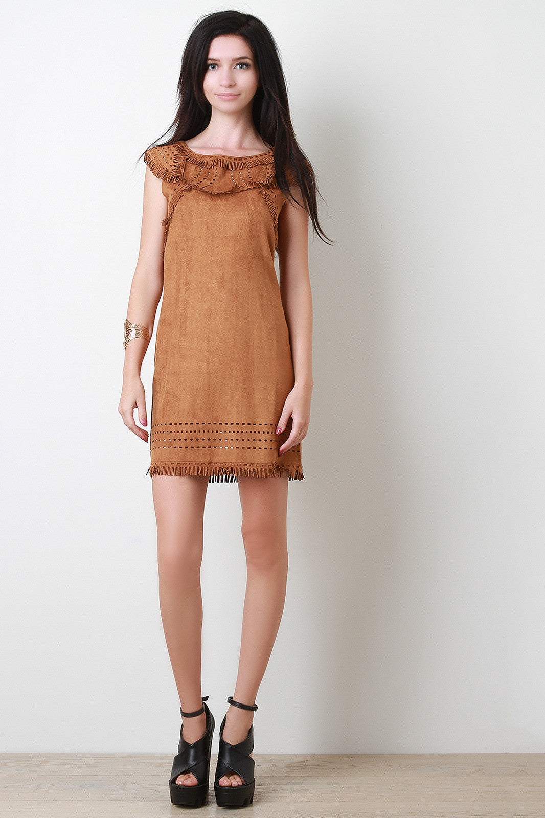 This microfiber vegan suede dress features a round neckline, cap sleeve design, and finished with fringe and eyelet cutout at yoke and hemline. Accessories sold separately. 95% Polyester, 5% Spandex.