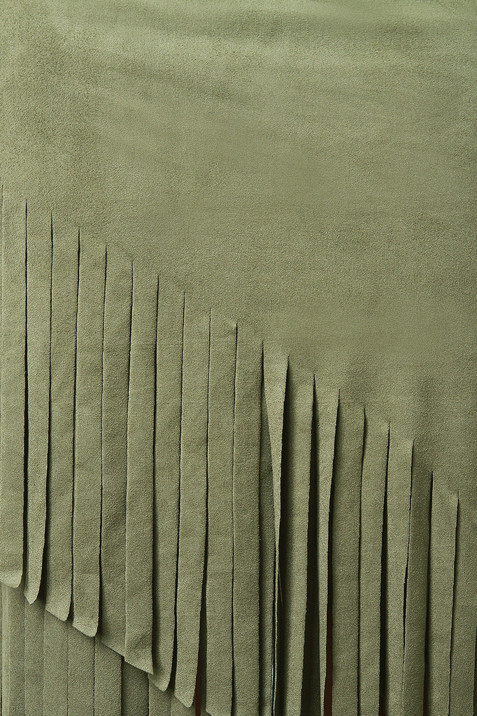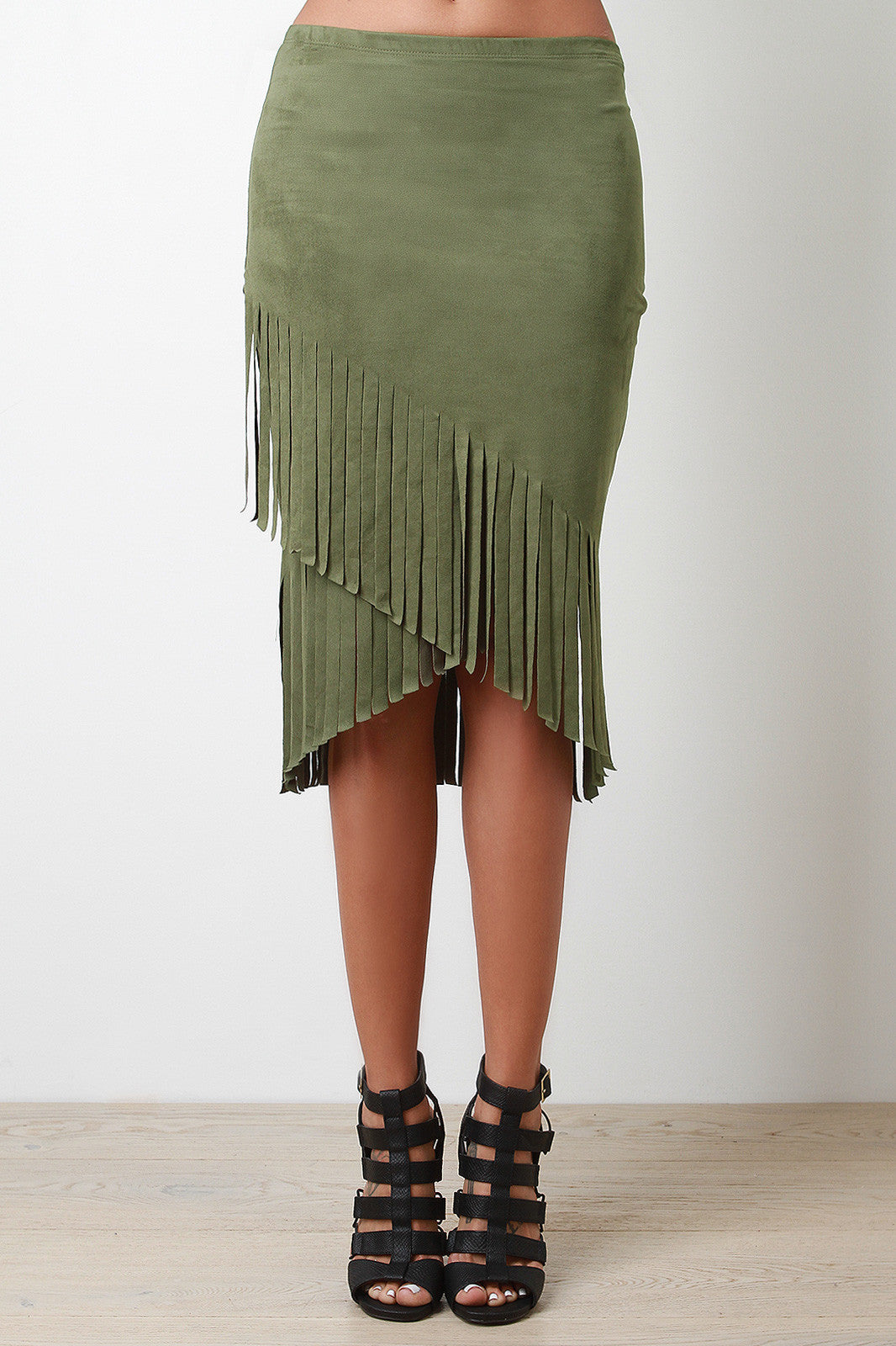This skirt features a microfiber vegan suede fabrication, overlapping tulip fringe tier front, and an elasticized hemline. Accessories sold separately. Made in U.S.A. 95% Polyester, 5% Spandex.
