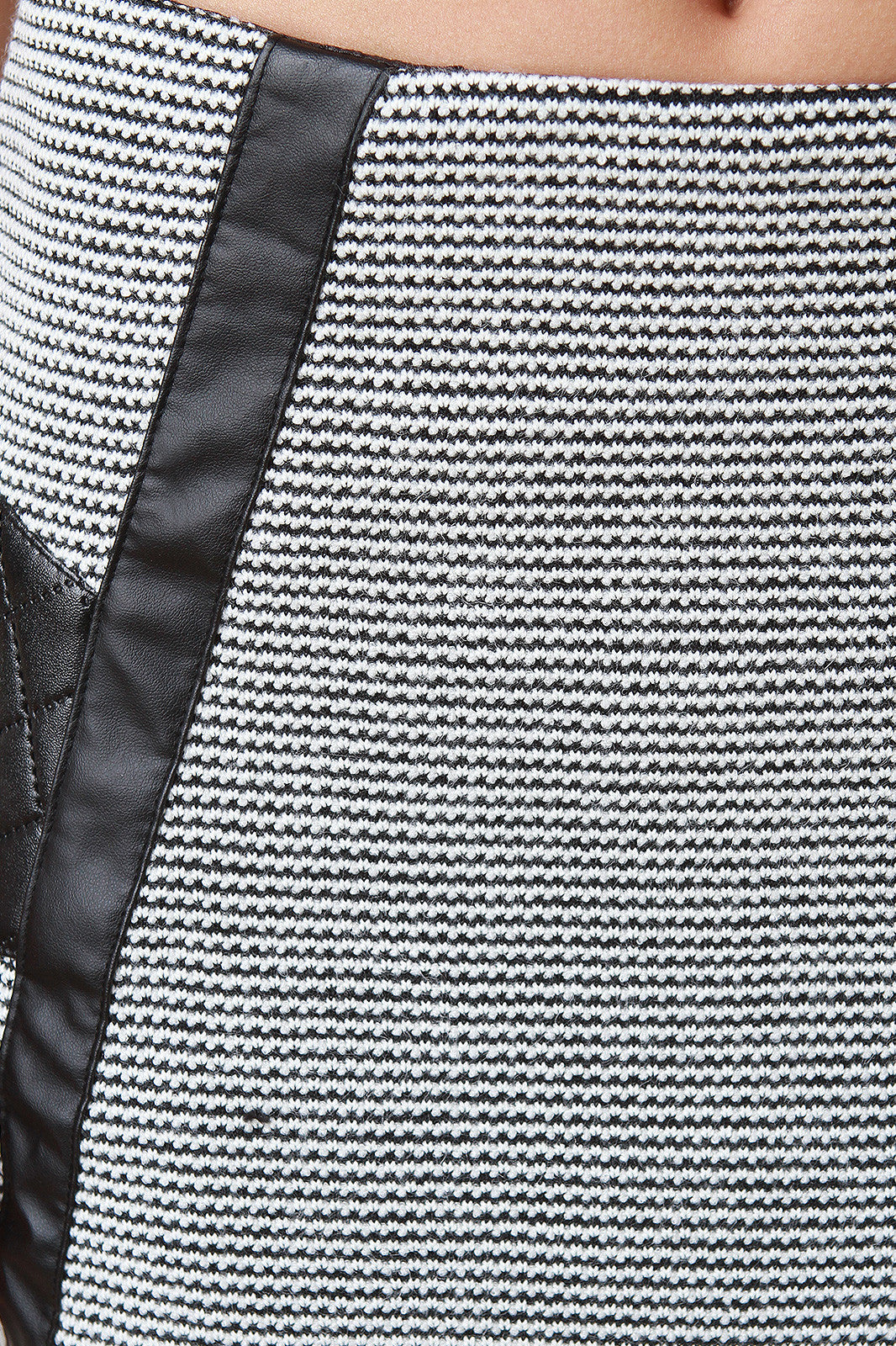 This mini skirt features two-tone texture knit fabrication, vegan leather quilted side panels, accent with vertical strips at front and back, completed with a hidden rear zipper fastener. Accessories sold separately. 40% Acrylic, 40% Polyester, 20% Rabbit Hair. Contrast: 50% Polyurethane, 50% Polyester. Lining: 100% Polyester.