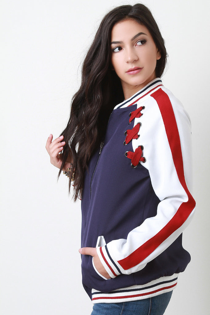 This bomber jacket features multi-color knit, zip-up front, stripe accents, criss-cross lace detail, two functional side pockets, and finished with lining. Accessories sold separately. 97% Polyester, 3% Spandex. Lining: 100% Polyester.