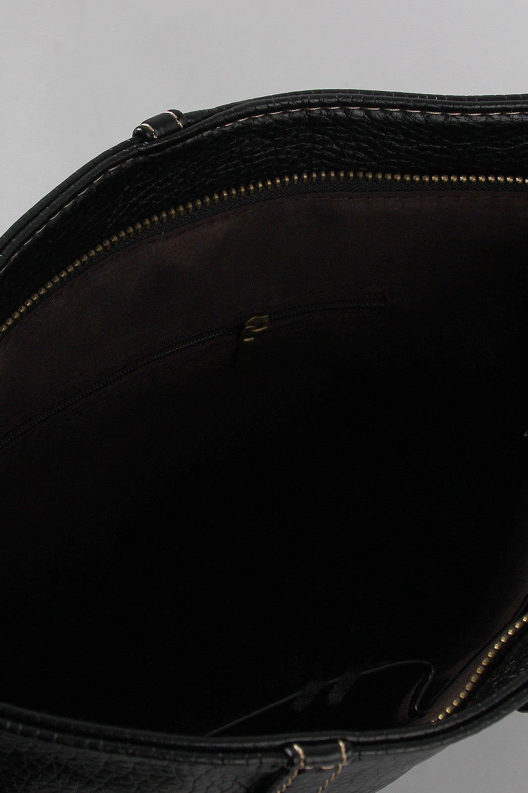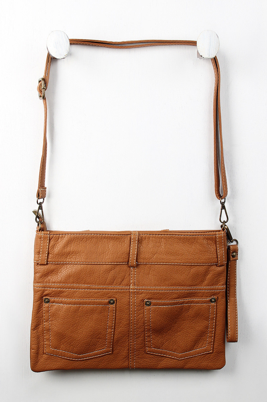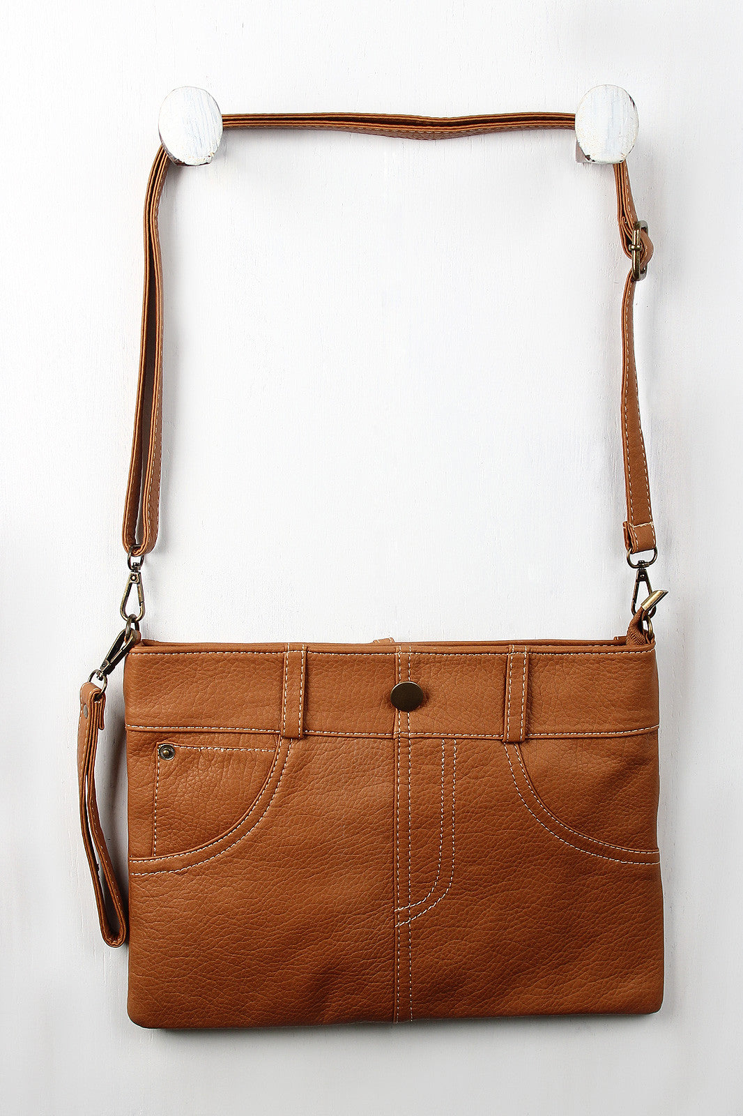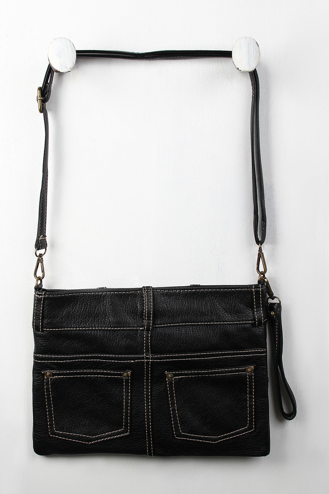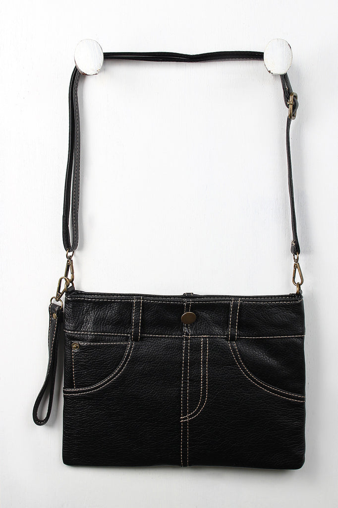 A thin clutch bag featuring a pebbled vegan leather skirt design with belt loops, button and stitching details, and functional back slip pockets. Main compartment unzips to a fully-lined interior with two slip pockets and one zipper pocket. Bag includes clutch strap (8.5" drop) and adjustable shoulder strap (15" drop).