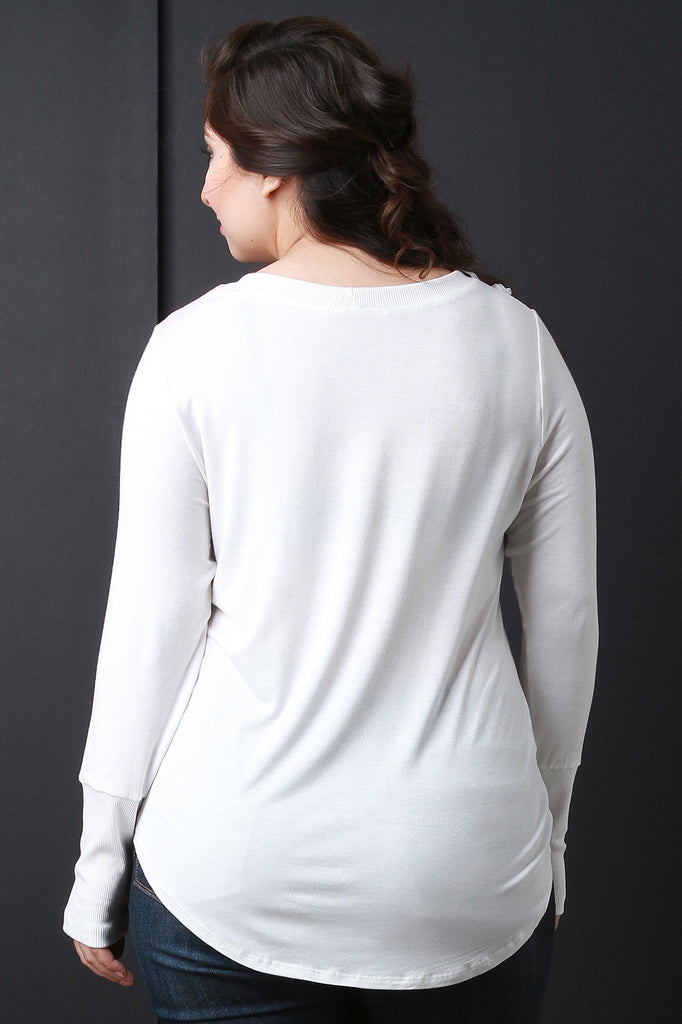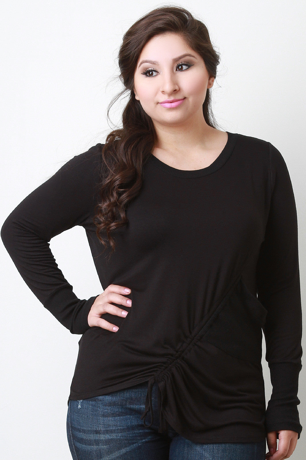 A unique plus size long sleeve top featuring a drawstring slanted scrunch design, a single side pocket constructed with contrasting ribbed material, and ribbed crew neckline. Finished with long sleeves and long ribbed cuffs. Accessories sold separately. Made in U.S.A. Self: 95% Rayon, 5% Spandex. Contrast: 100% Cotton.