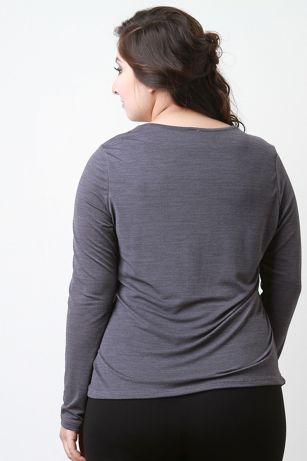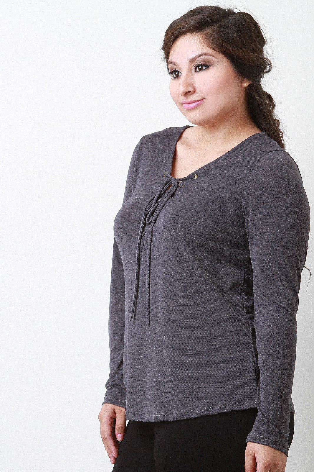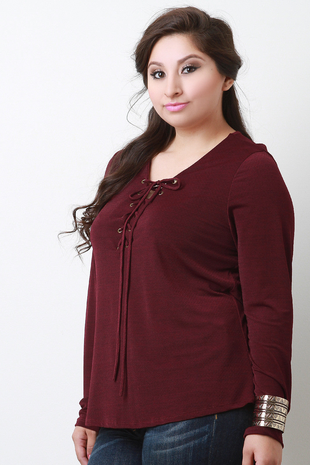 A plus size peasant-style top with a cool textured fabric, v-neckline with lace up front and bronze-tone eyelets, and long sleeves. Unlined. Accessories sold separately. Made in U.S.A. 96% Polyester, 4% Spandex.