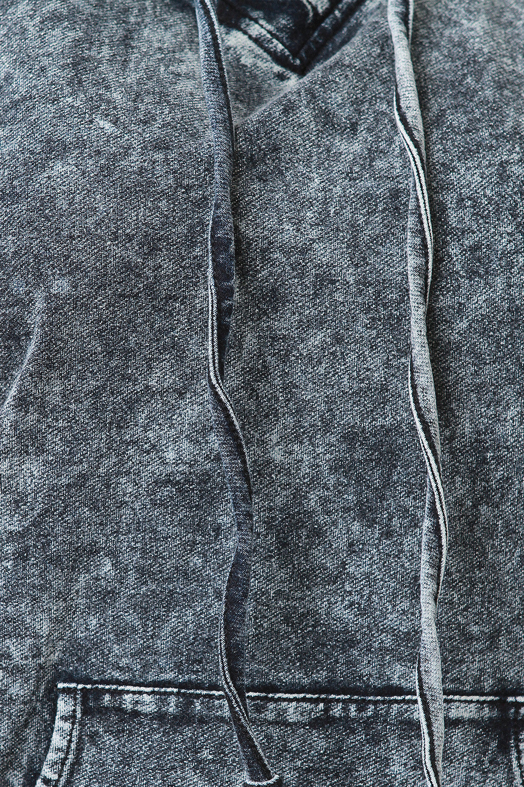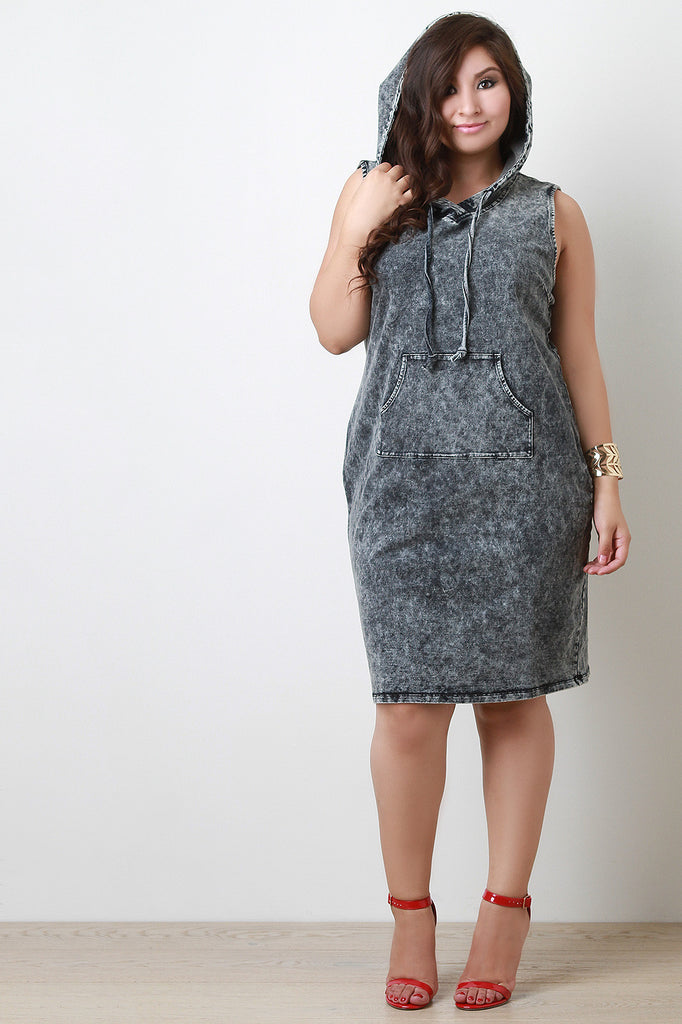 This plus size midi dress features a hooded neckline with drawstring tie, acid wash denim throughout, sleeveless design, front kangaroo pocket, and finished with mid length straight hemline.