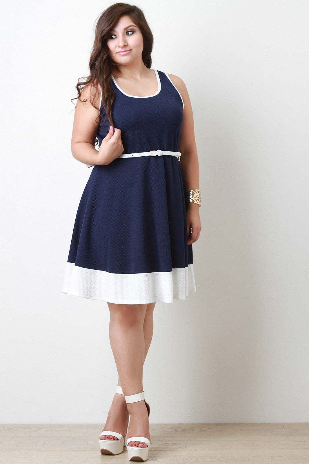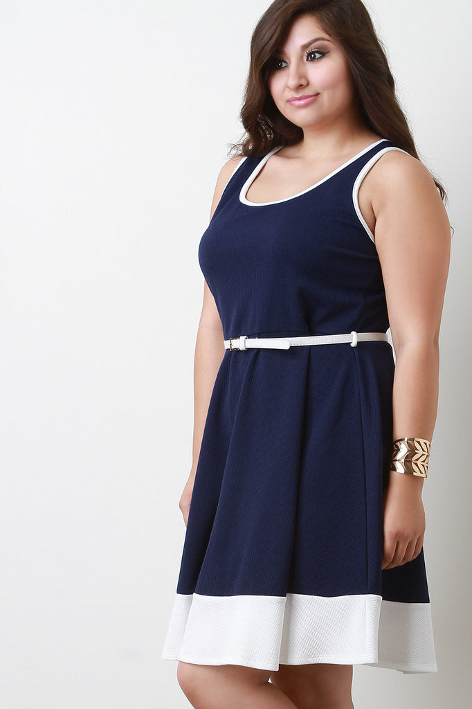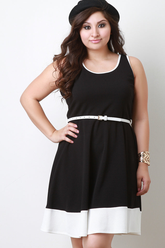 This gorgeous plus size skater dress features a round neckline, sleeveless design, contrasting panels trim, and teardrop cutout  detail with button closure. Finished with thin vegan leather belt with adjustable buckle fastening. Accessories sold separately. Made in U.S.A. 95% Polyester, 5% Spandex.