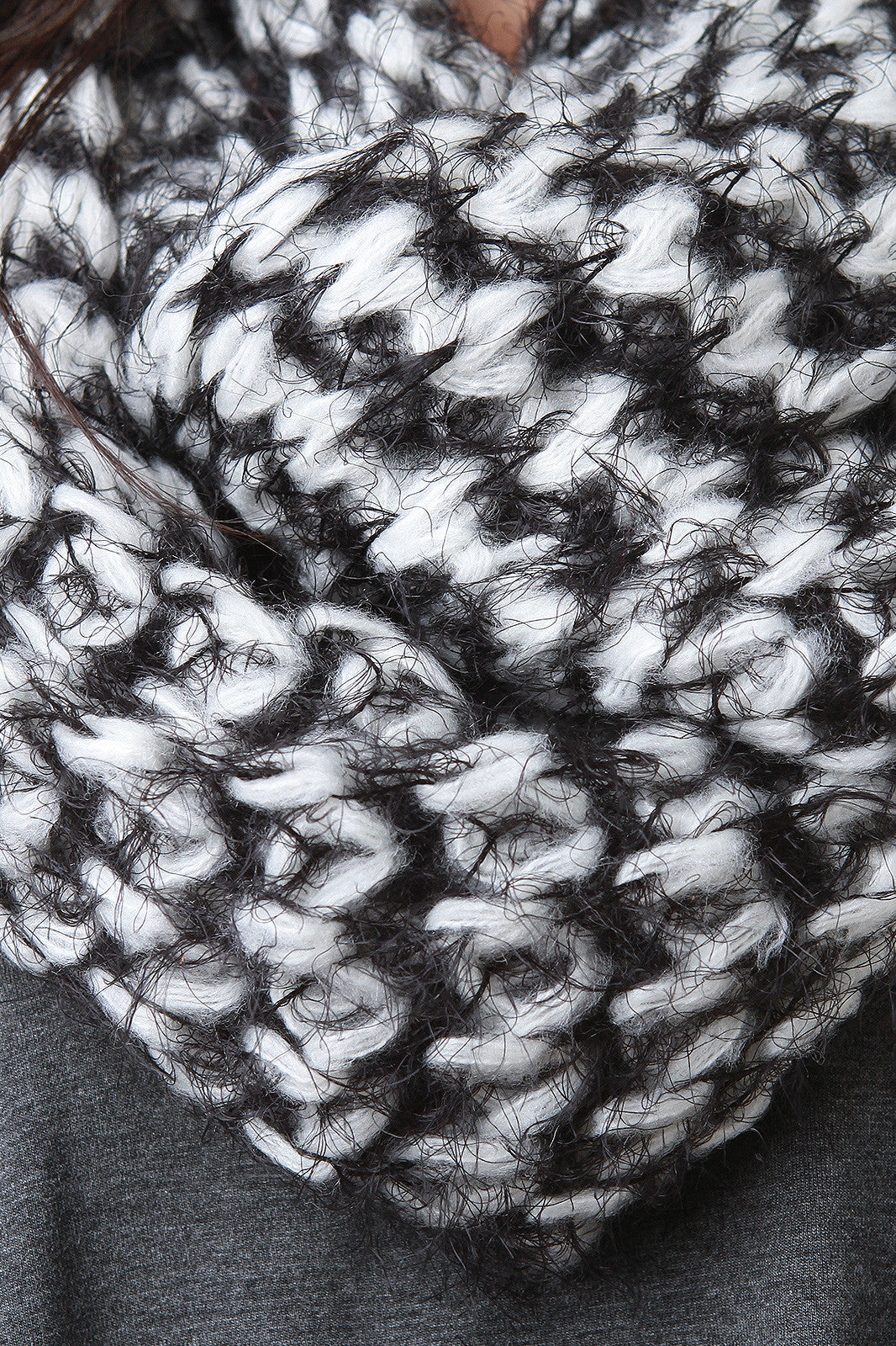 A two-tone infinity scarf featuring a loose fuzzy knit. 100% Acrylic.
