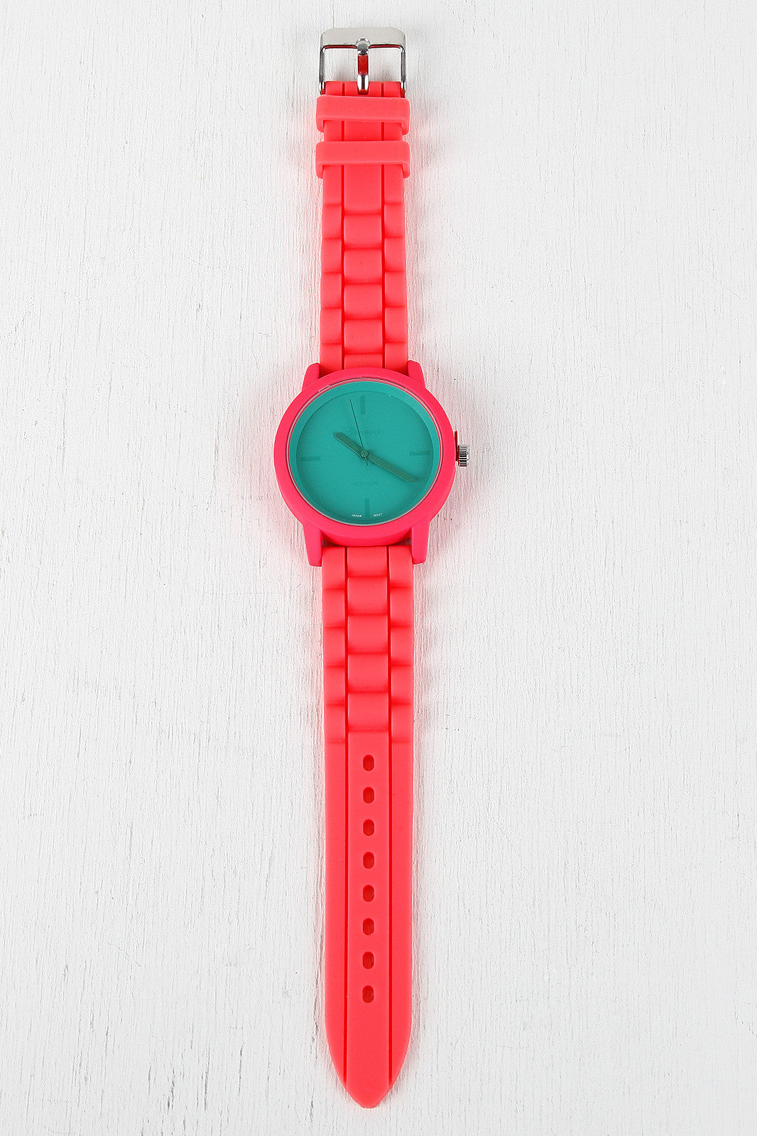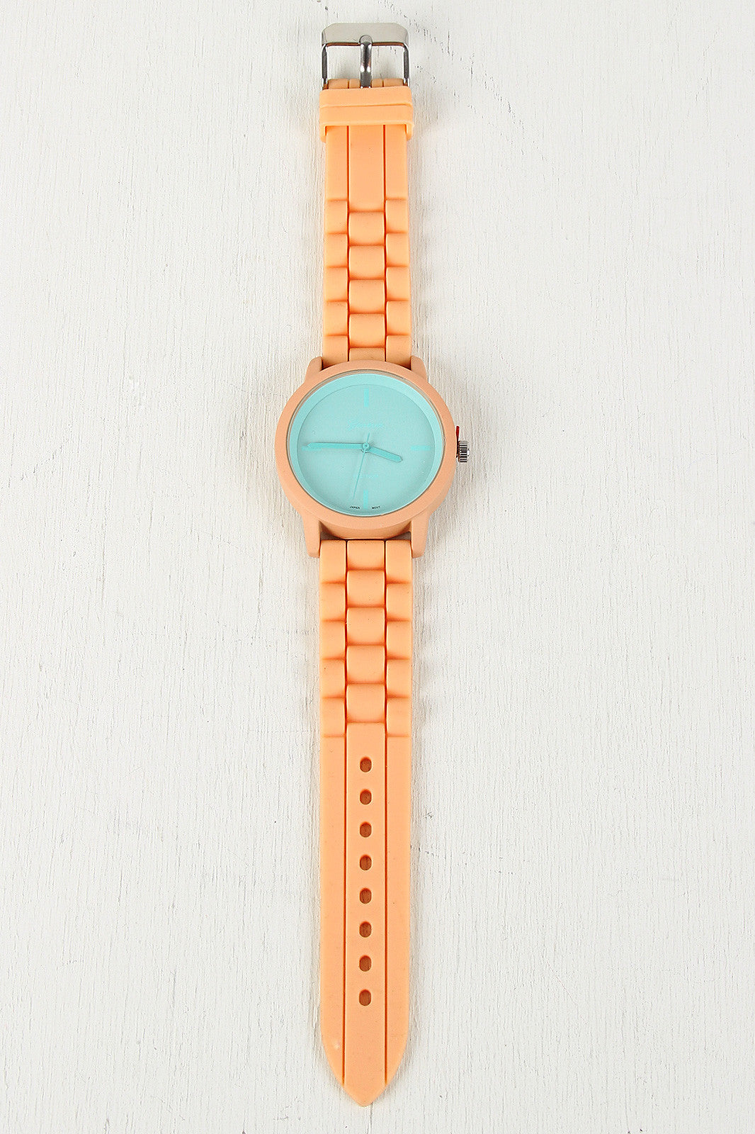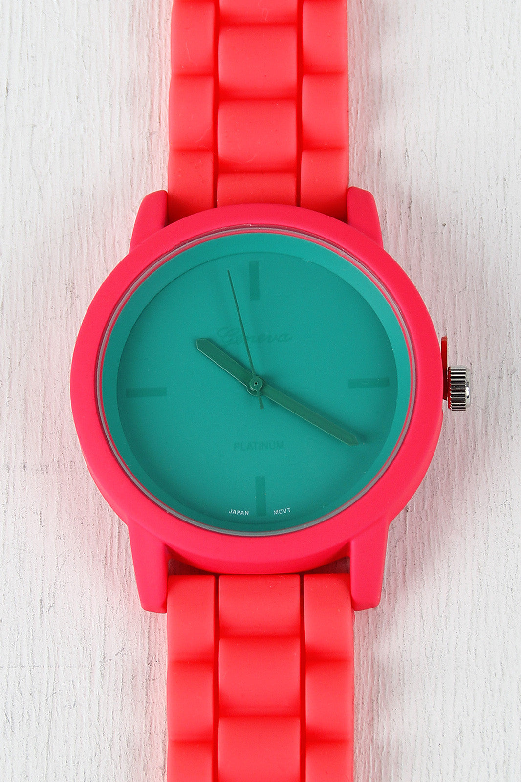 This two tone watch features a round rubber bezel, four hour markers, with a rubber faux link strap. Finished with two keepers and adjustable buckle closure.
