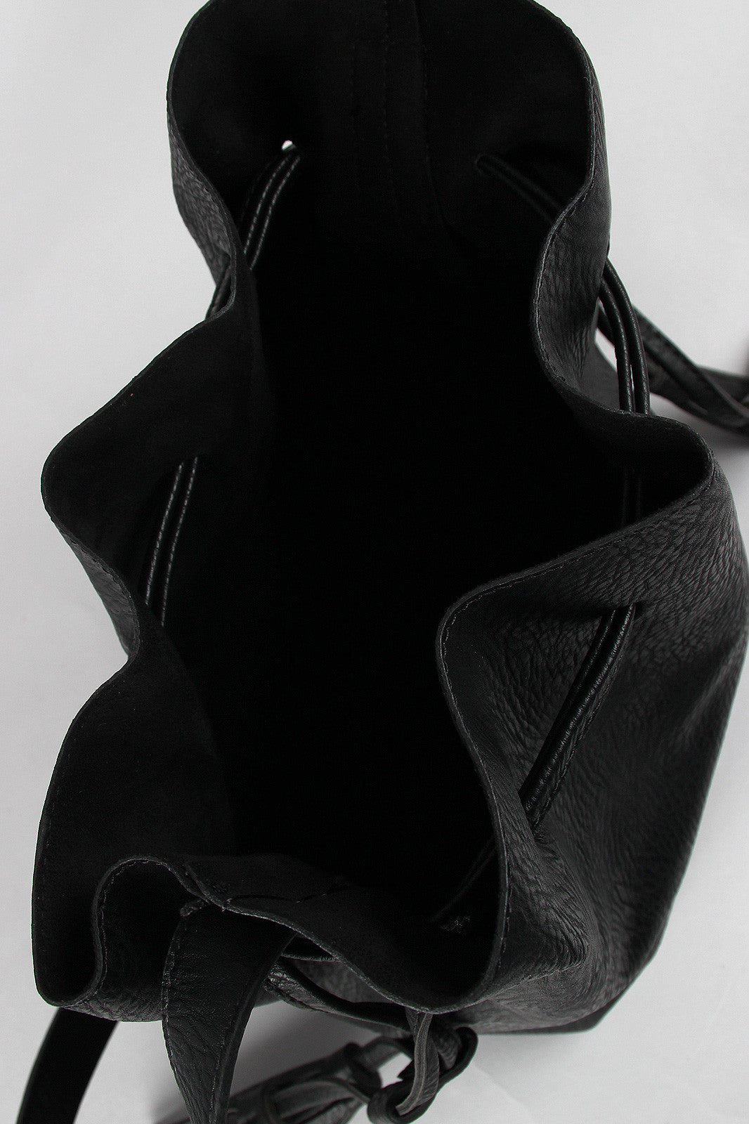 This vegan leather bucket bag features two side drawstring closures with tasseled ends, a suede-like interior, and a structured bottom. The shoulder strap has a 19" drop and is adjustable with push studs.