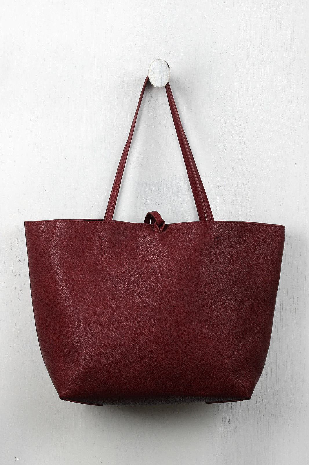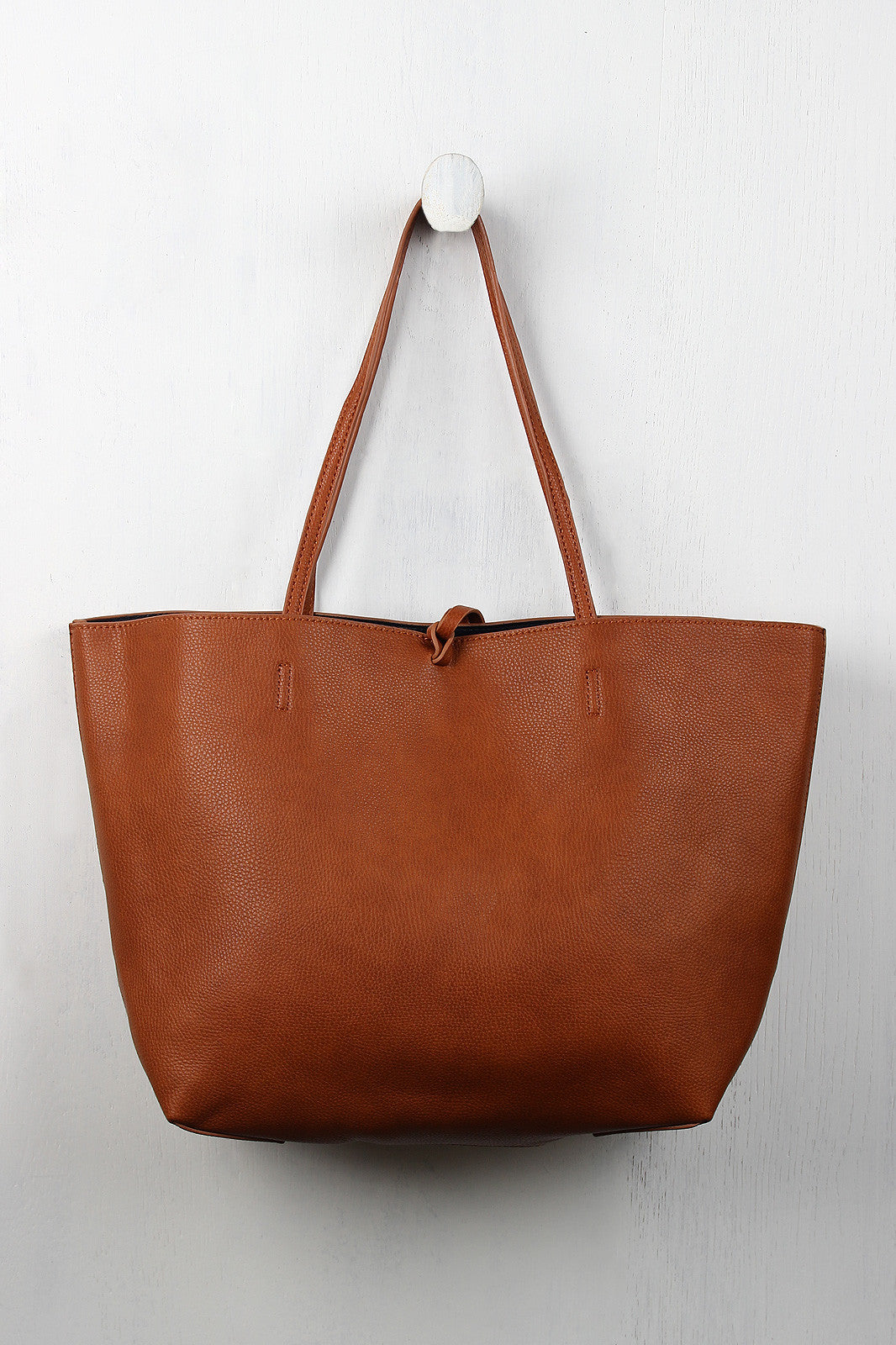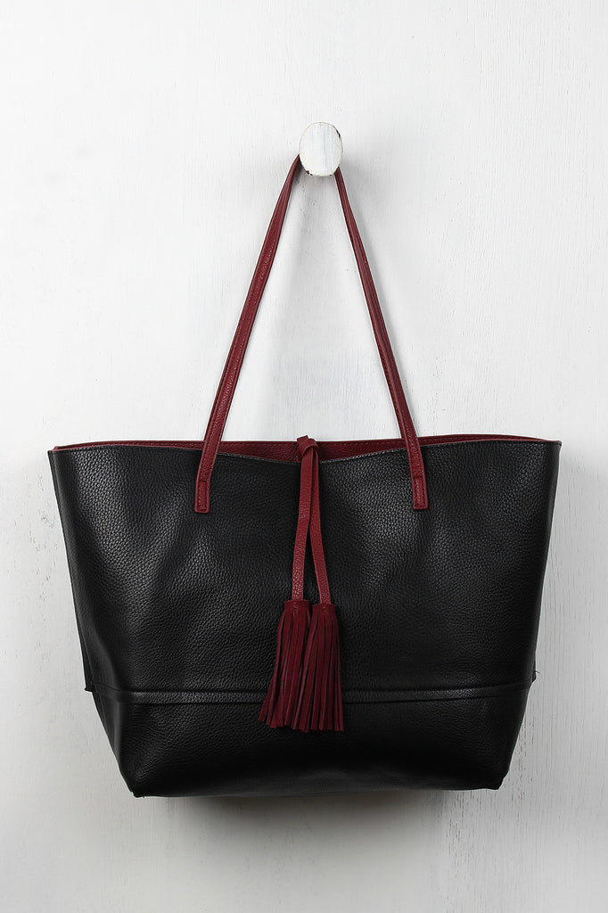 This large tote features a real suede paneled side, a contrast color vegan leather on the reverse side, and thin flat top handles with 9.5" drop. Finished with knotted tassel embellishments and matching zippered pouch.