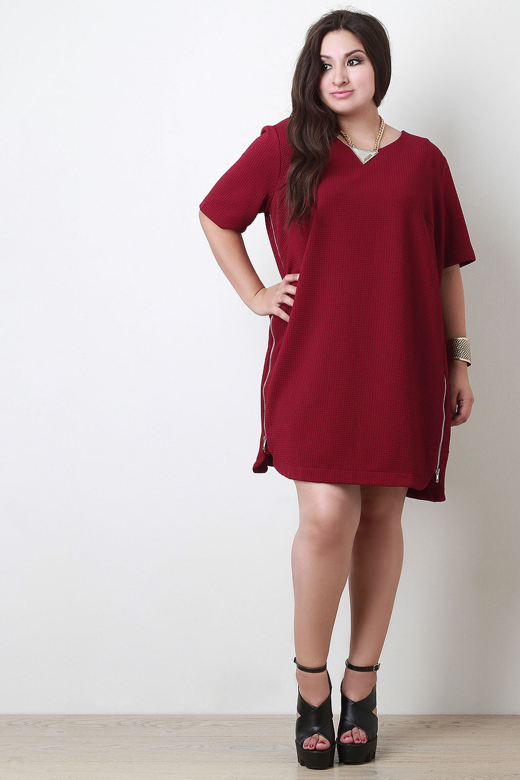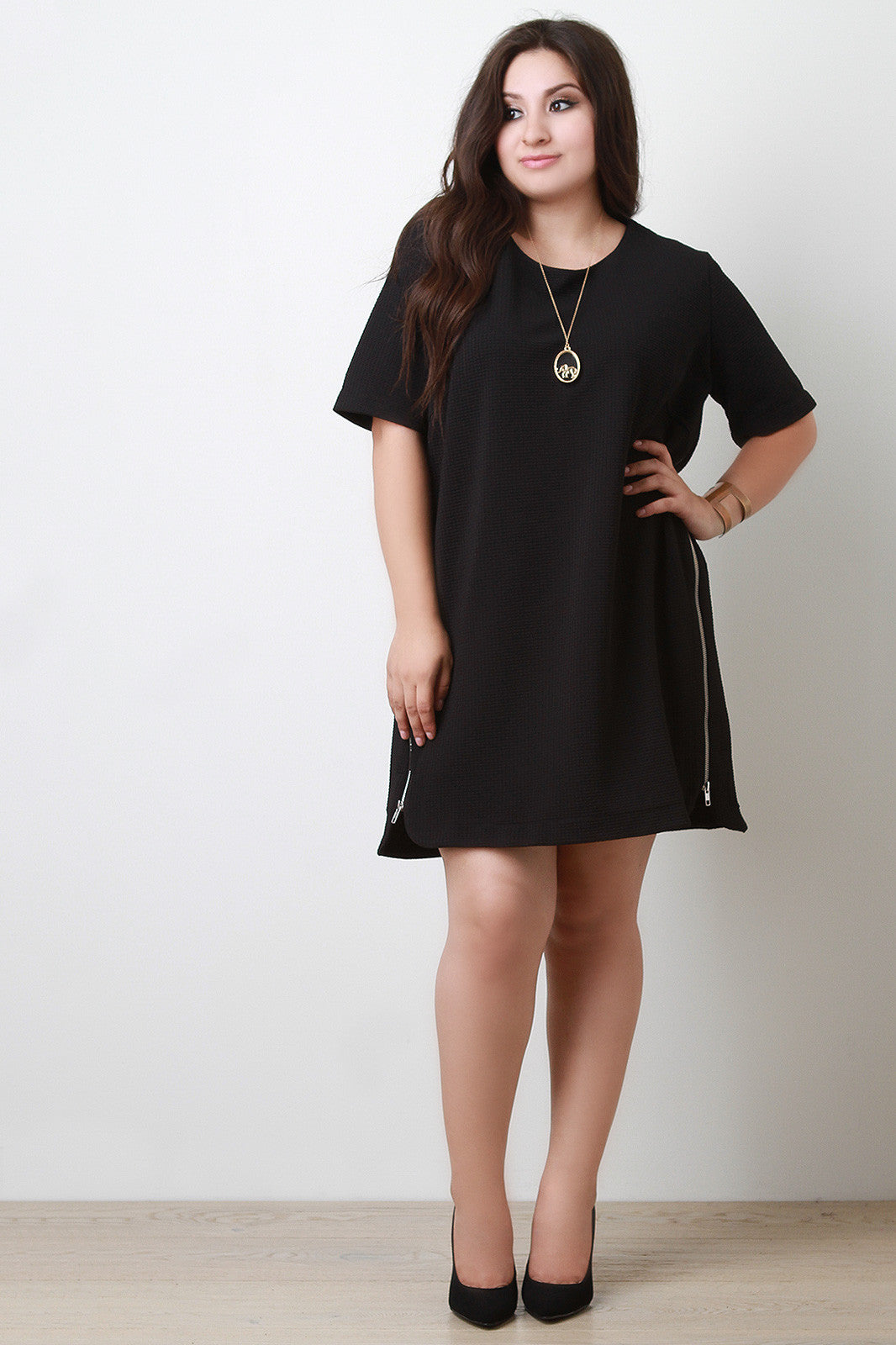 A plus size shift dress featuring a grid texture throughout, round neckline, short sleeves, and shift fit. Sides can be unzipped for a further relaxed fit. Accessories sold separately. 95% Polyester, 5% Spandex.