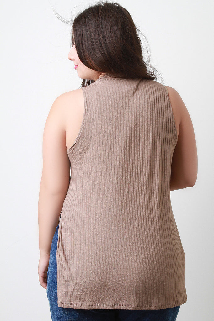 This plus size top is fall style with a ribbed design throughout and mock neck sleeveless bodice. It is slight high-low hemline, featuring two side slits. Accessories sold separately. 97% Rayon. 3% Spandex.