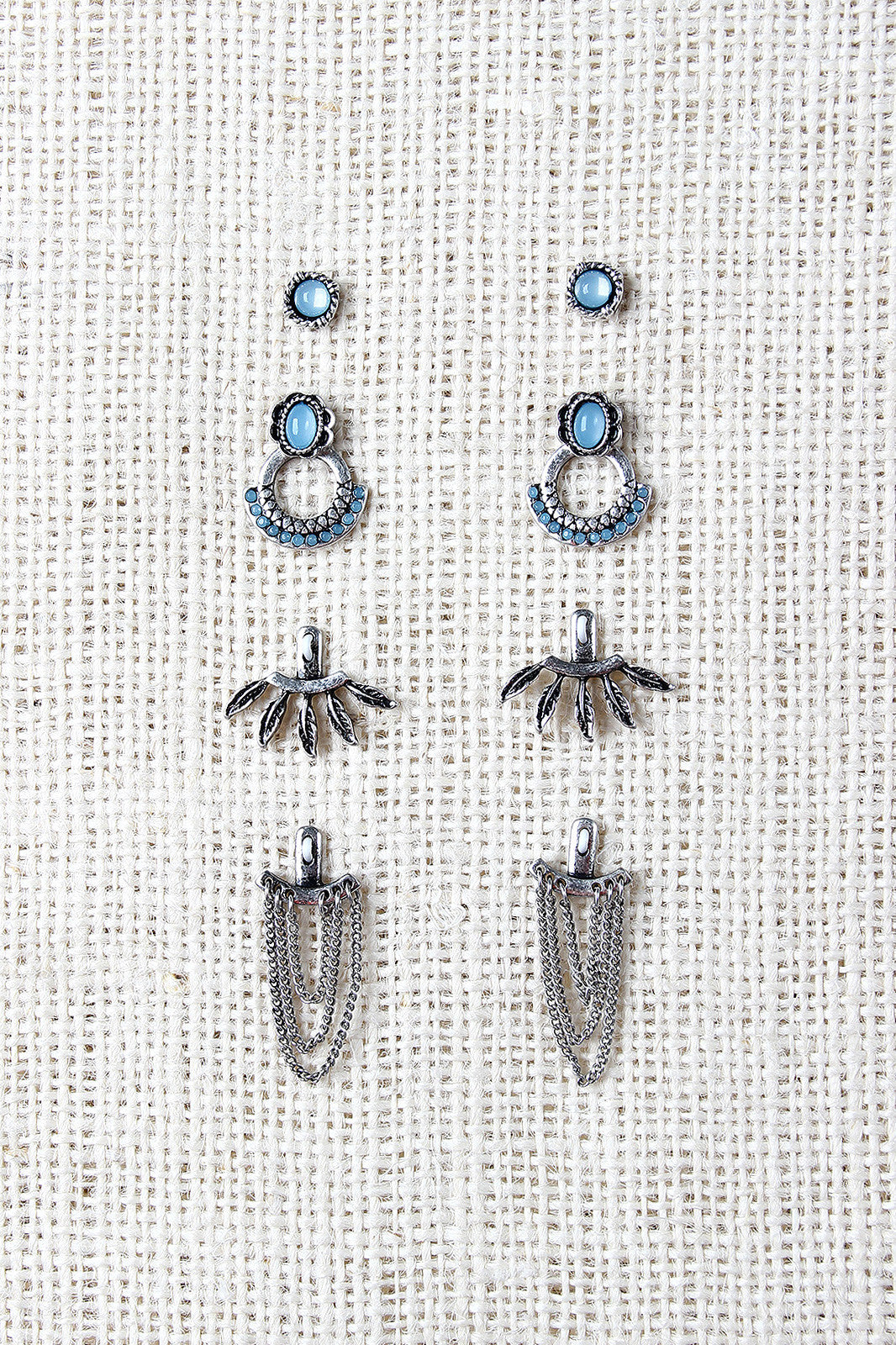 This ear jacket earrings set features two pairs of studs and three pairs of jackets. The studs feature an iridescent stone set in a textured bezel with post backs, and the jackets feature embellished rings, fanned feathers, and looped curb link chain designs. Mix and match for alternate looks!
