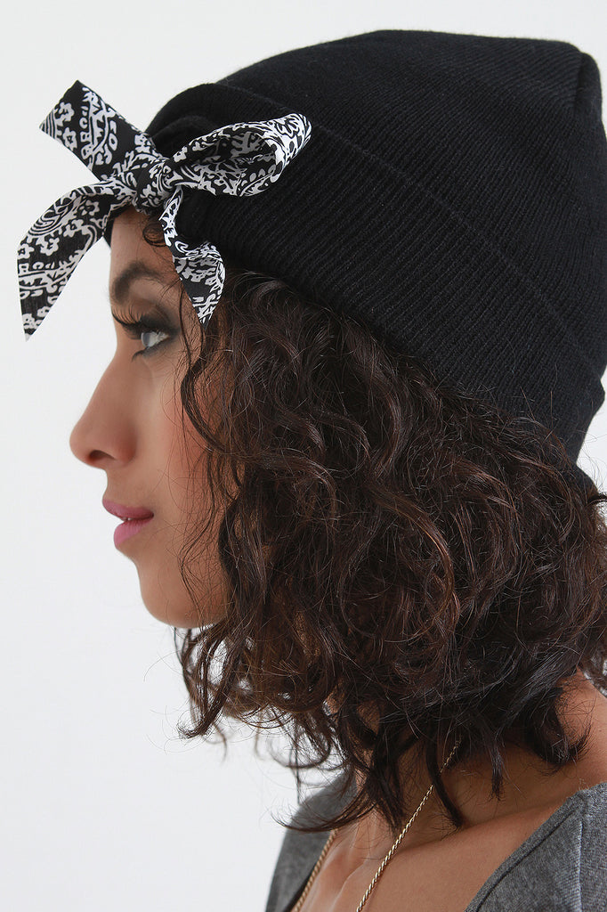 A snug beanie featuring a turned up brim and self-tie bandana bow accent. 100% Acrylic.