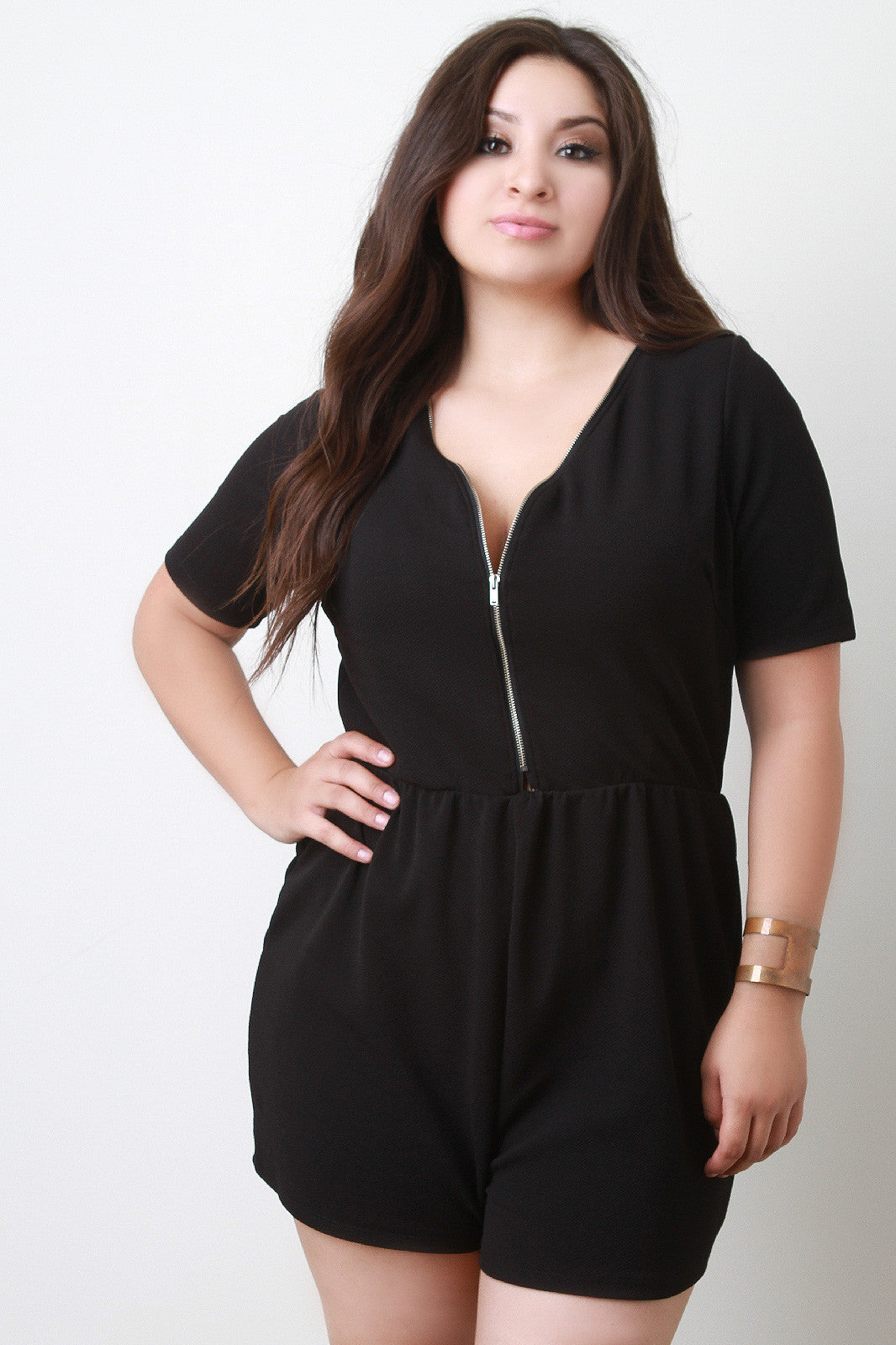 This plus size romper features textured knit, deep v-neckline, zipper decor at front and back, short sleeves, and elasticized waist. Accessories sold separately. Made in U.S.A. Self: 95% Polyester, 5% Spandex. Contrast: 100% Polyester.