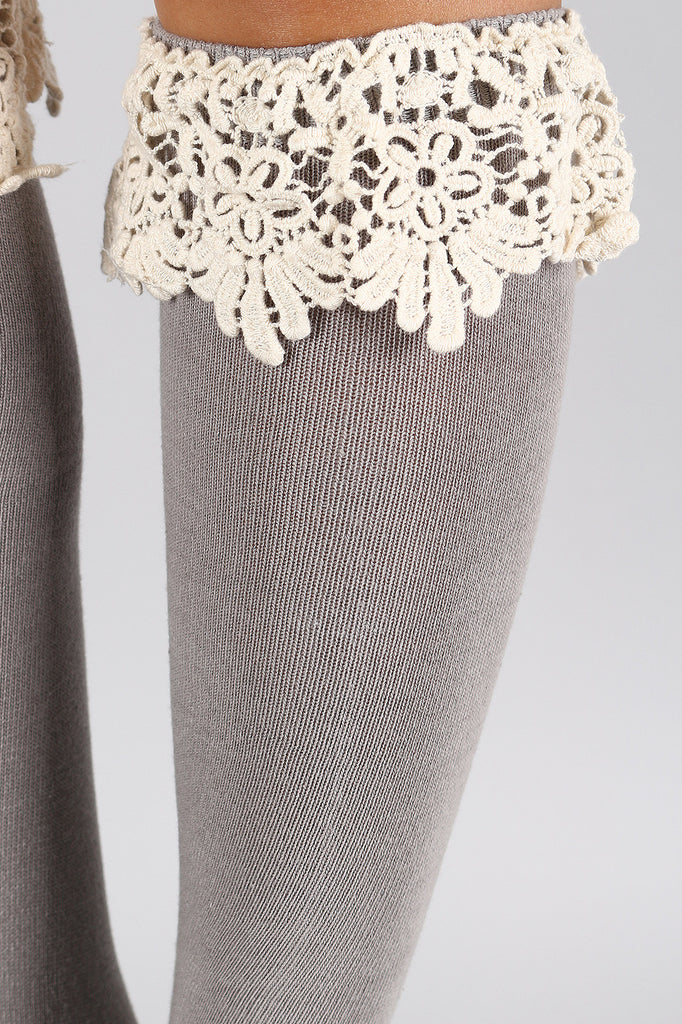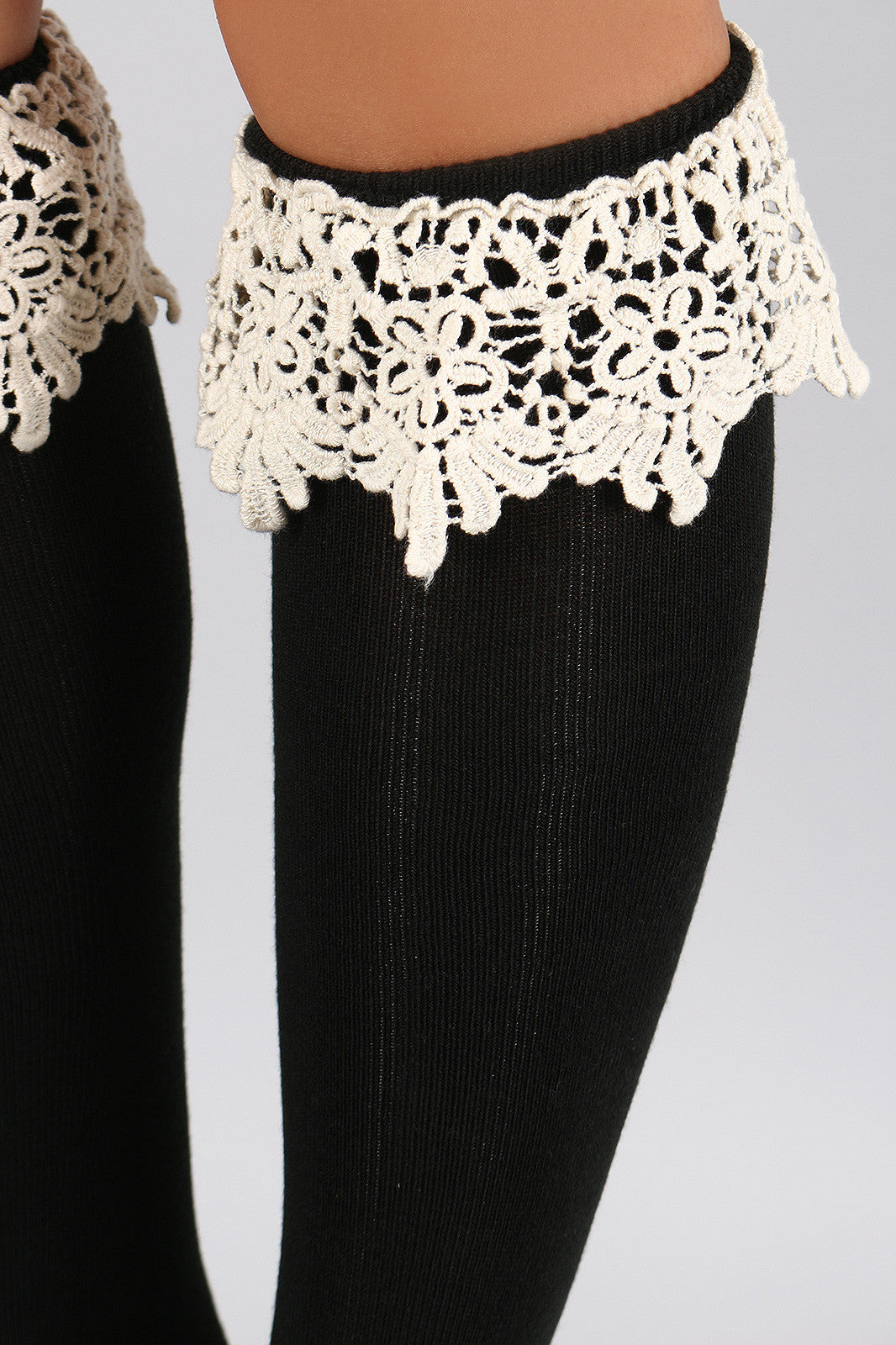 Knee high socks featuring a solid knit construction with floral crochet cuff accent.
