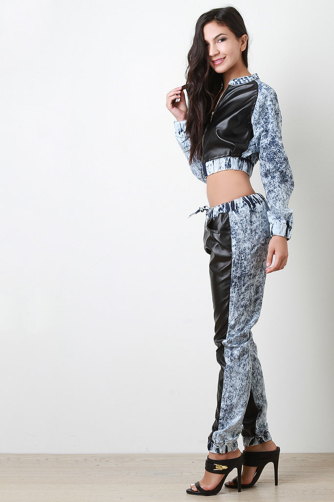 This cropped jacket was designed with an acid wash effect and two front vegan leather panels. Lightweight structure. Features full front zipper and elasticized arm openings and hemline. Accessories sold separately. 75% Cotton. 22% Polyester. 3% Spandex.