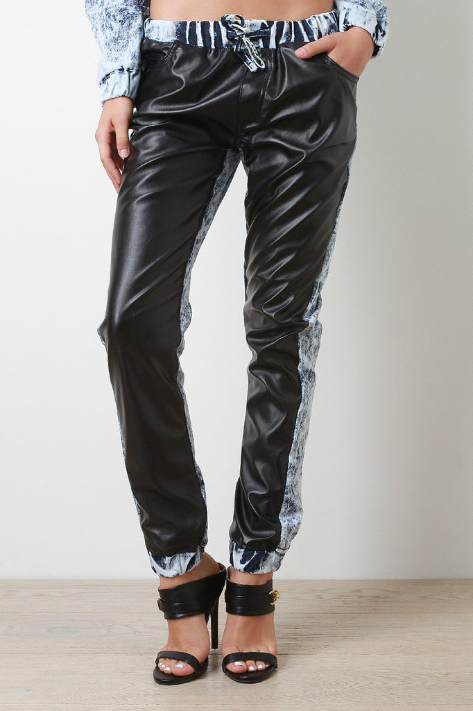 These joggers were designed with an acid wash effect, two front vegan leather panels, and two front pockets. Lightweight structure. Features elasticized waist with drawstrings closure and elasticized leg openings. Accessories sold separately. 75% Cotton. 22% Polyester. 3% Spandex.
