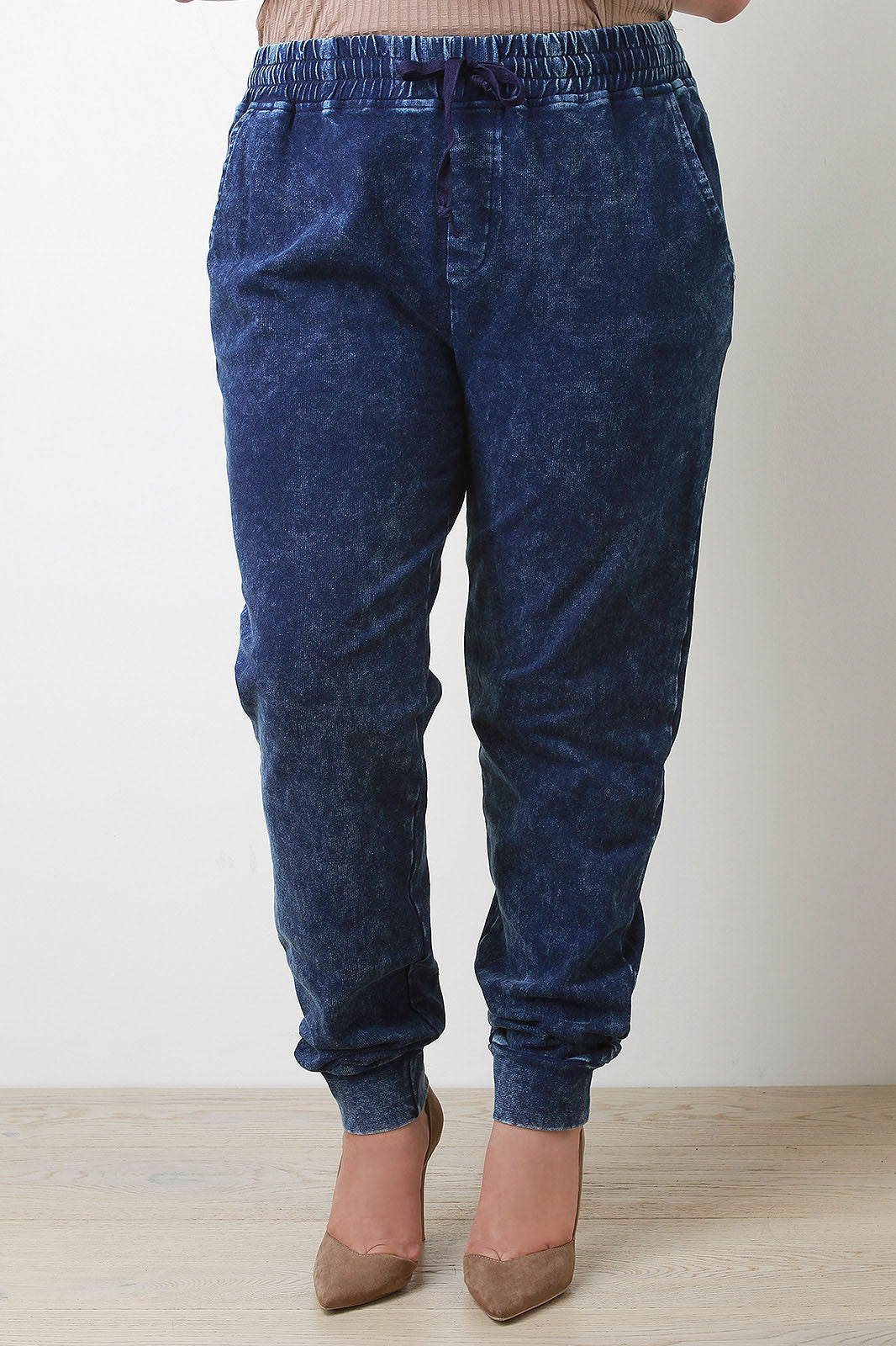 These plus size joggers pants feature washed denim, ruched elastic waistband with self-tie bow, and cuffed legs. Accessories sold separately. 96% Cotton, 4% Spandex.