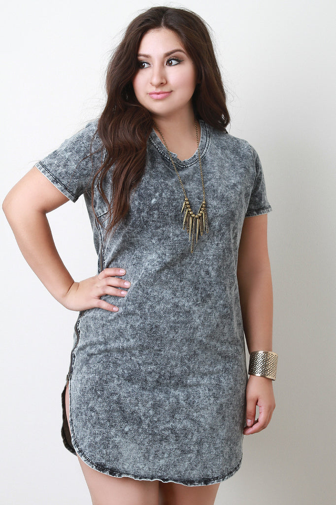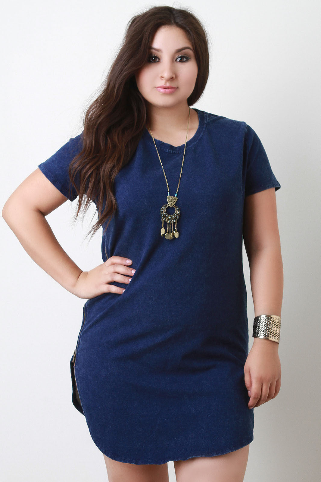 This plus size t-shirt dress features a washed denim, round crew neck, and short sleeves. Finished with a curved hemline, high side slits, and a functional side zipper embellishment. Accessories sold separately. 96% Cotton, 4% Spandex.