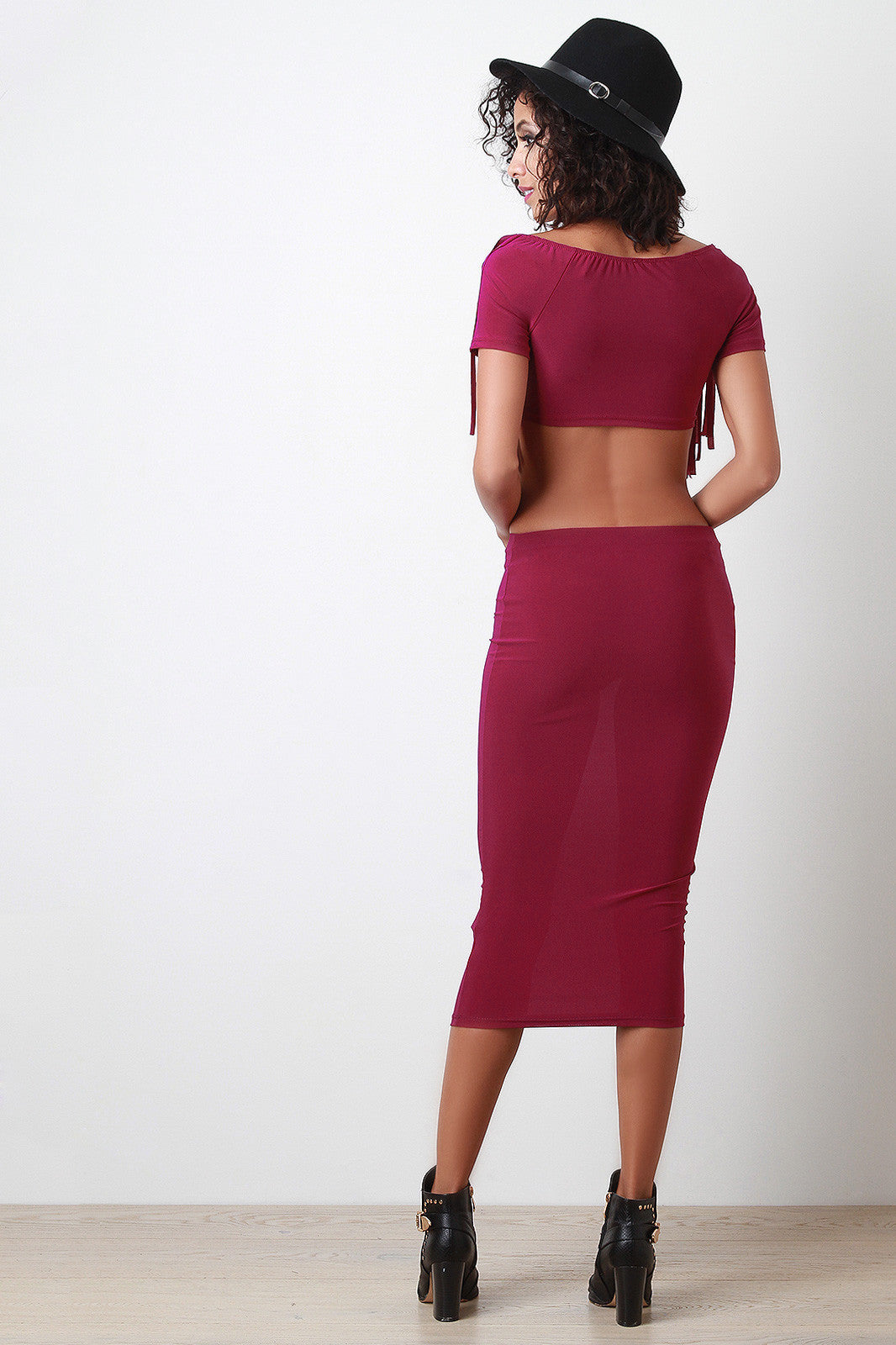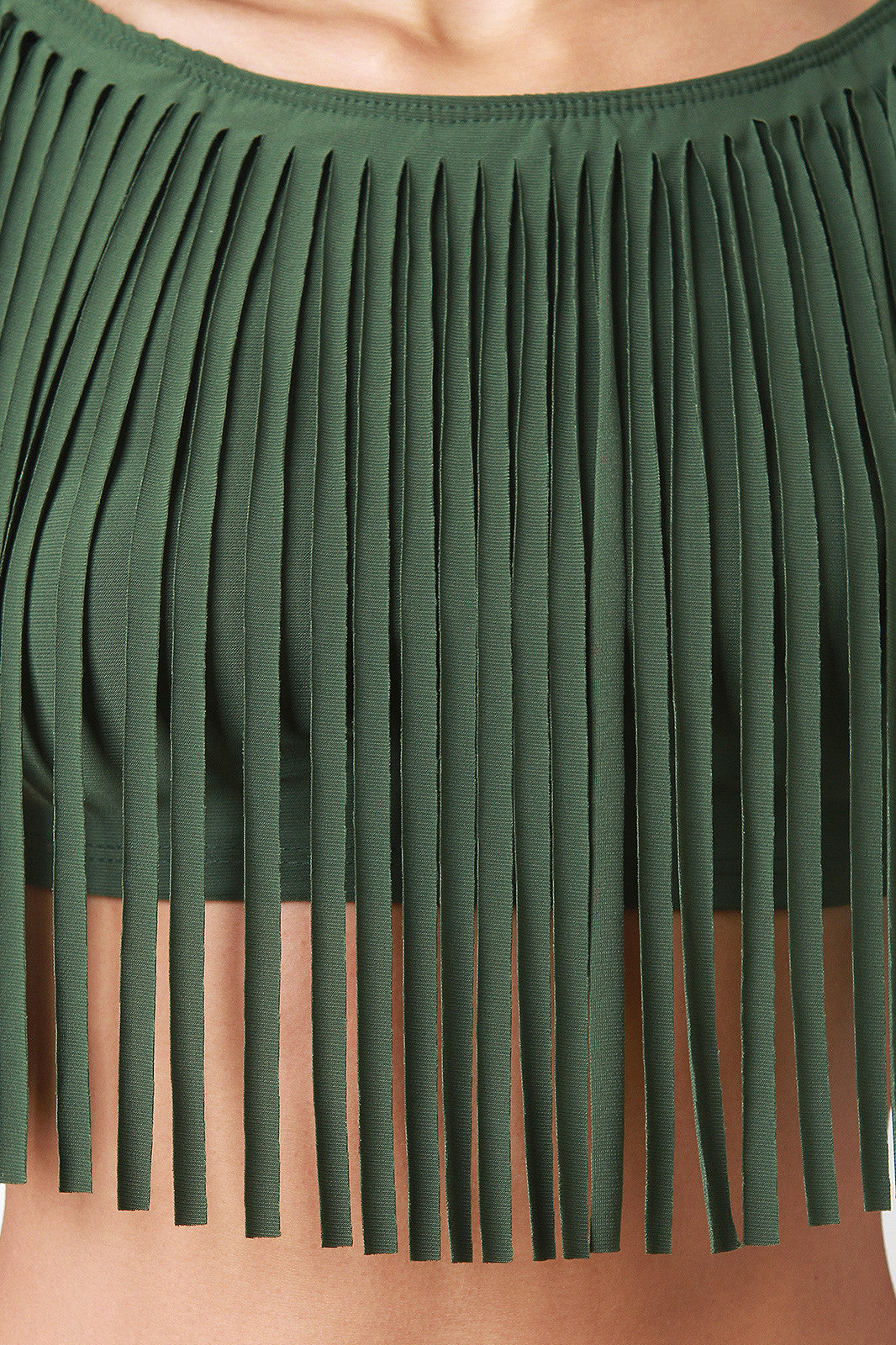 This swingy crop fringe detail at front, and crop hemline. Accessories sold separately. Made in U.S.A. 96% Polyester, 4% Spandex.