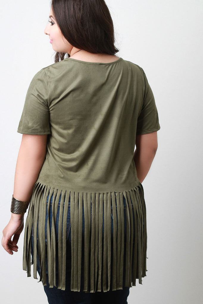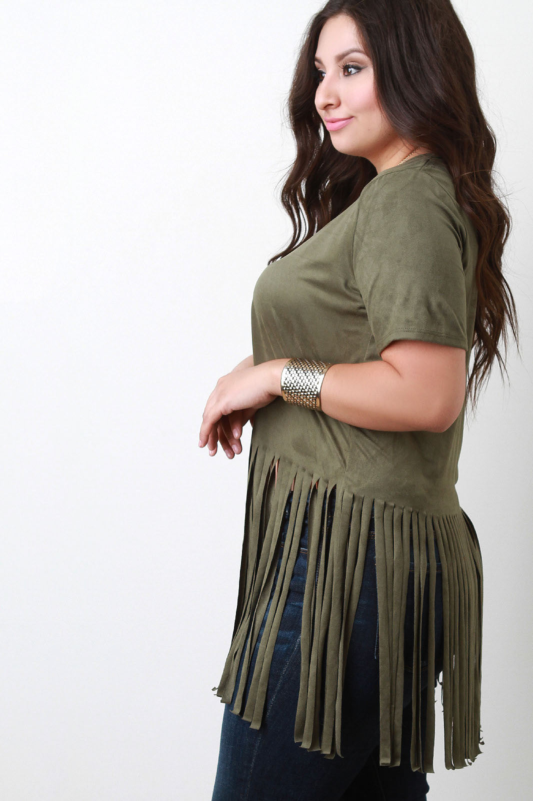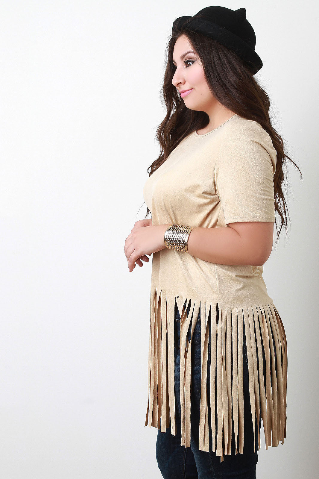 A plus size short sleeve fringe hem. Accessories sold separately. Made in U.S.A. 95% Polyester, 5% Spandex.