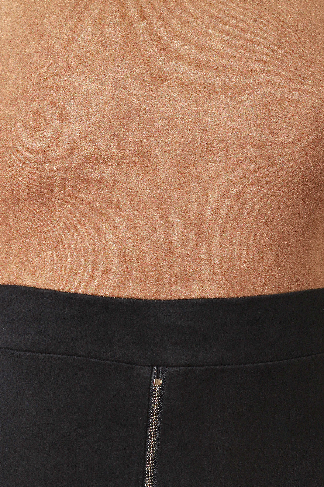 This midi dress features a soft microfiber vegan suede fabrication, mock turtle neckline, sleeveless cutaway construction, racer back and a hidden zipper fastener. Contrasting colorblock bottom half continue with a cinched high waist panel, pencil cut skirt, and an exposed front zipper design. Accessories sold separately. 90% Polyester, 10% Spandex.
