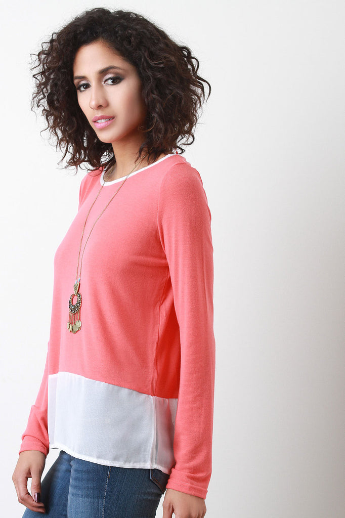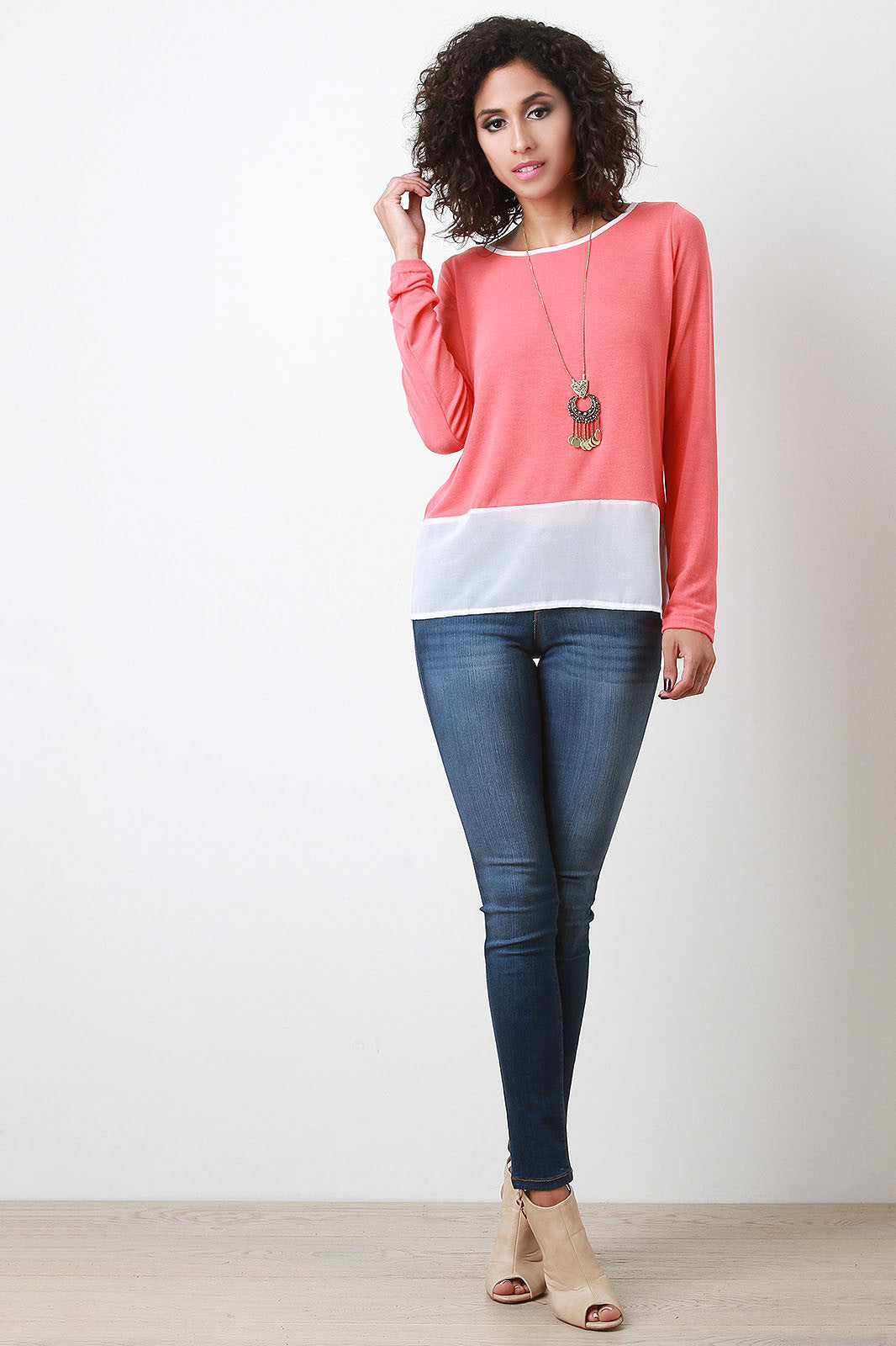 A long sleeve jersey top with a round neckline and contrasting chiffon panel at hem. Unlined. Accessories sold separately. 60% Polyester, 35% Viscose, 5% Spandex.