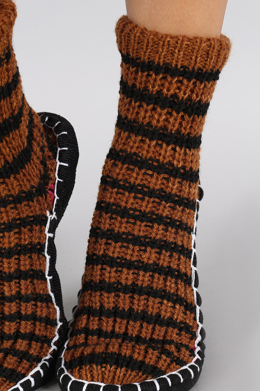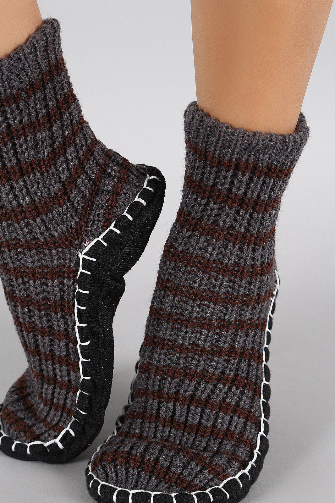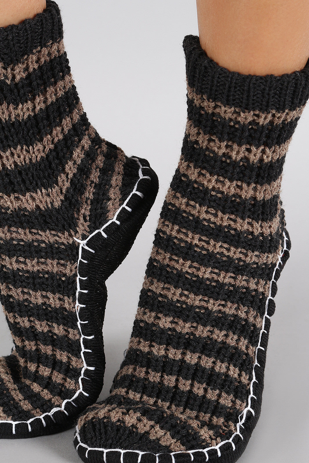 These knit stripe pattern upper, elastic collar, and blanket stitched edge. Finished with slip-resistant dots at the bottom of the sole.