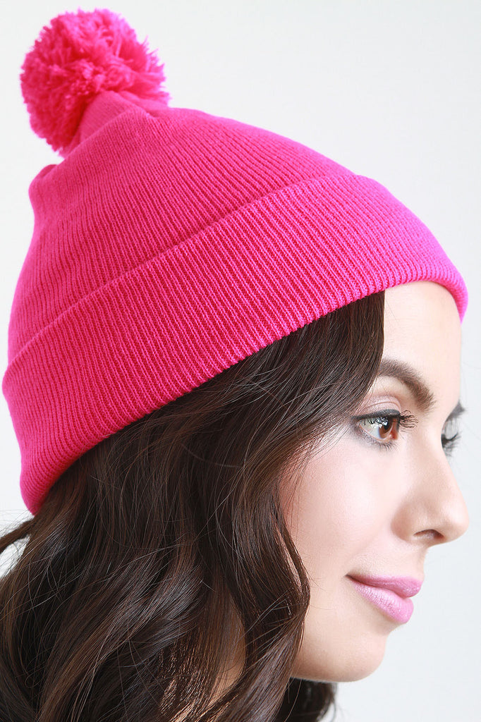 A close-fitting beanie featuring solid color ribbed knit, pom pom at the top, and a turned up brim. 100% Acrylic.