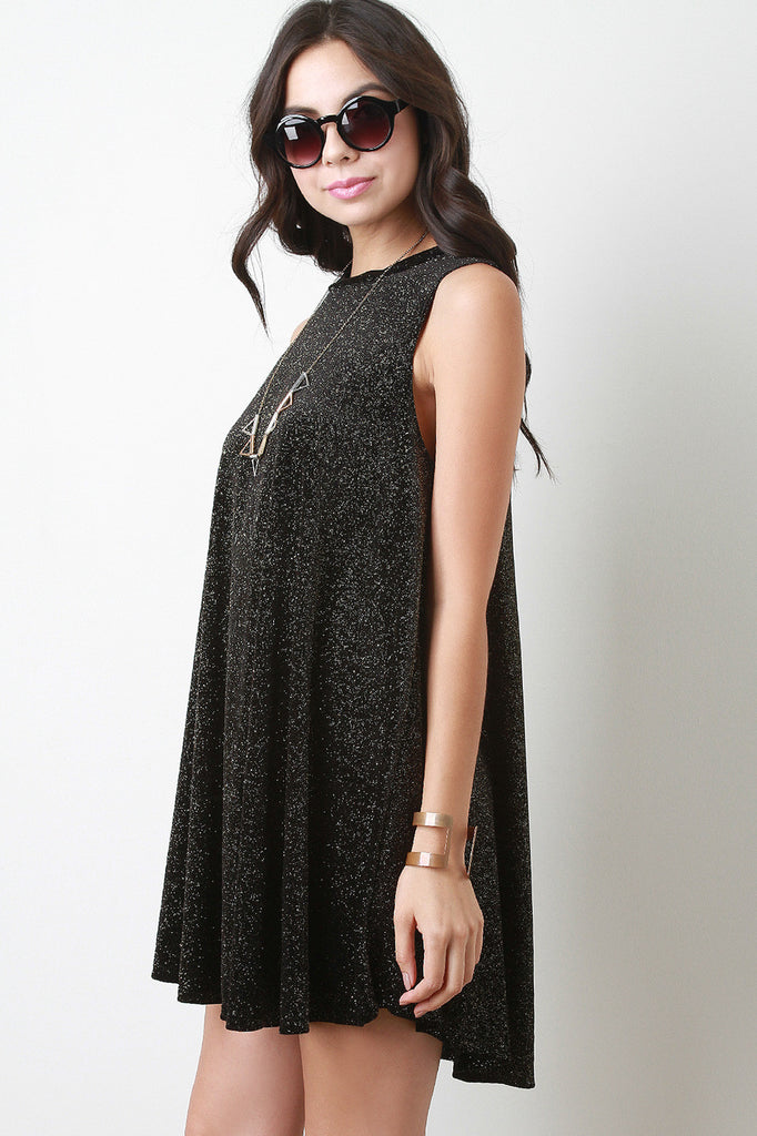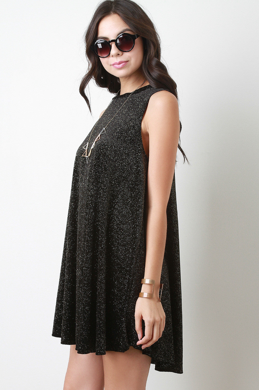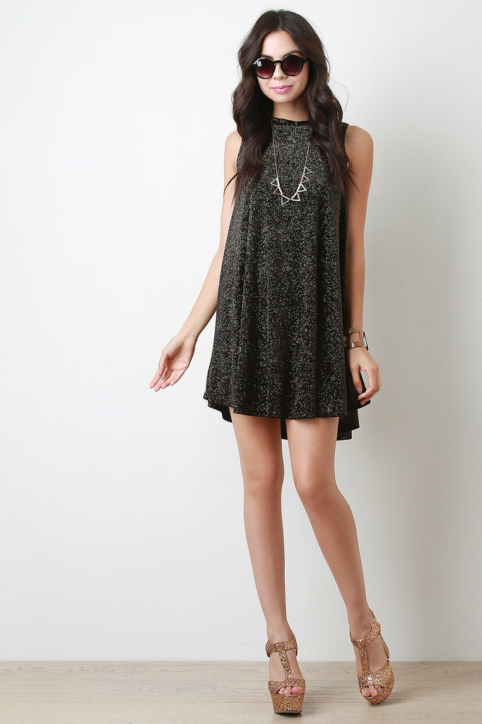 This flare cocktail dress features a mock neckline, all over shimmering glitter throughout, sleeveless design, and finished with high-low hemline. Accessories sold separately. Made in U.S.A. 90% Polyester, 10% Spandex.