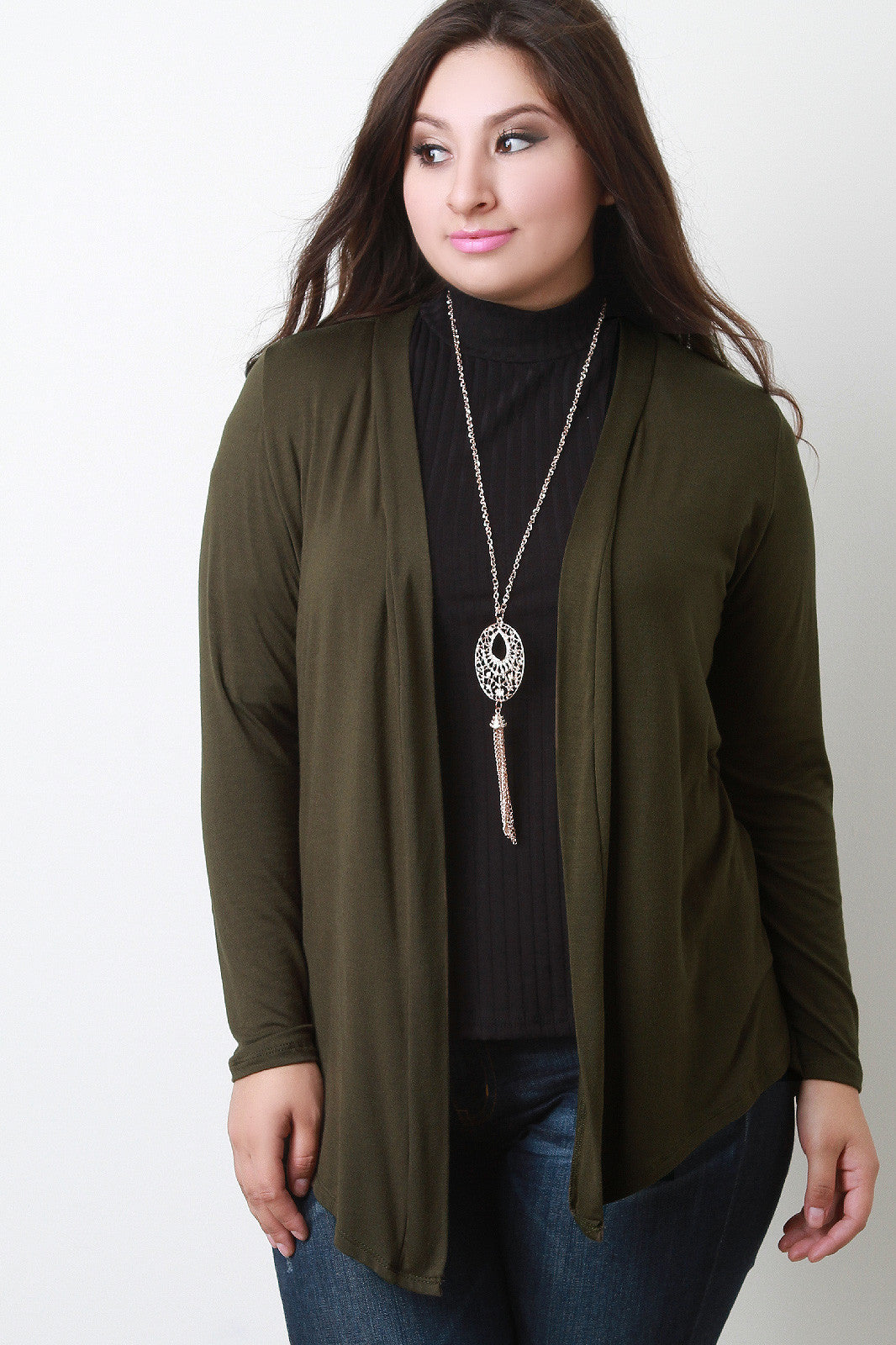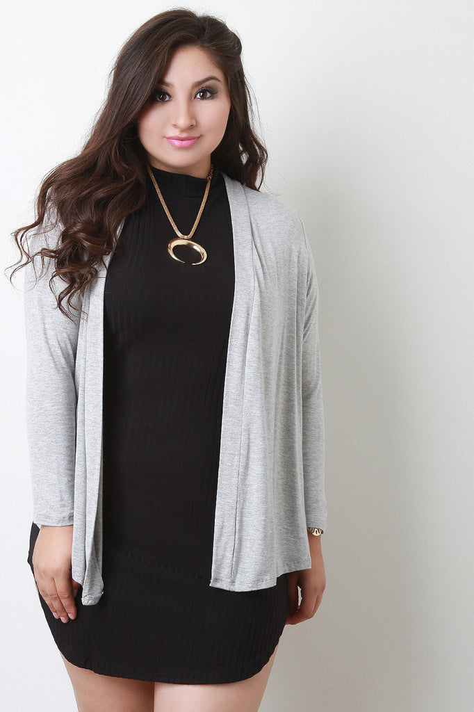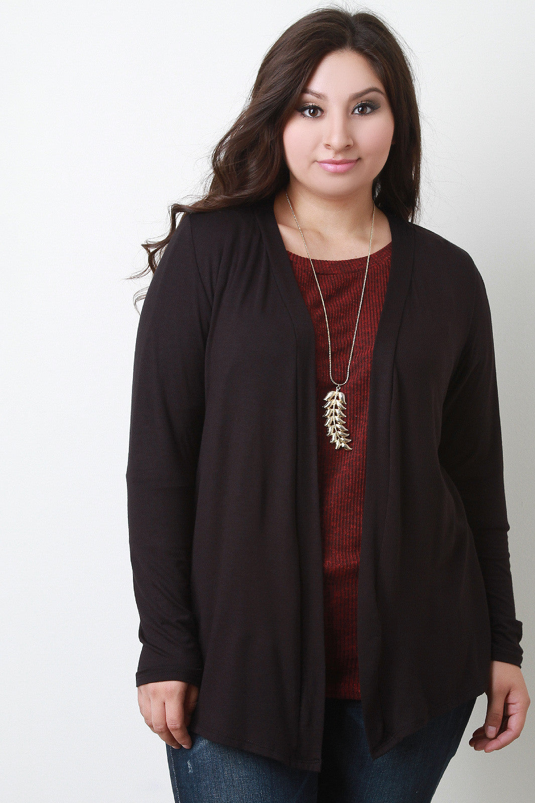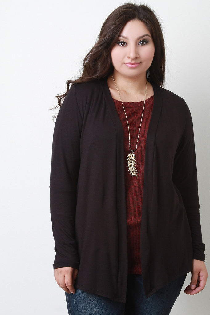 This plus size cardigan features a soft jersey knit, straight collar and open front, and full sleeves. Accessories sold separately. 97% Rayon, 3% Spandex.