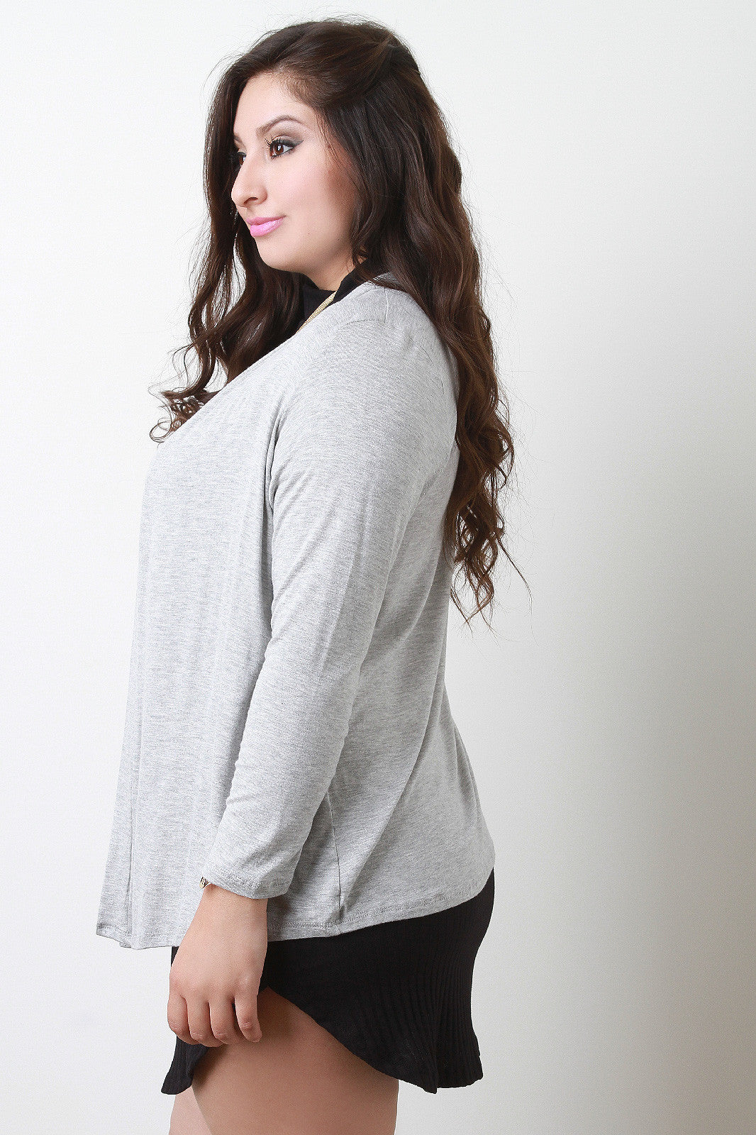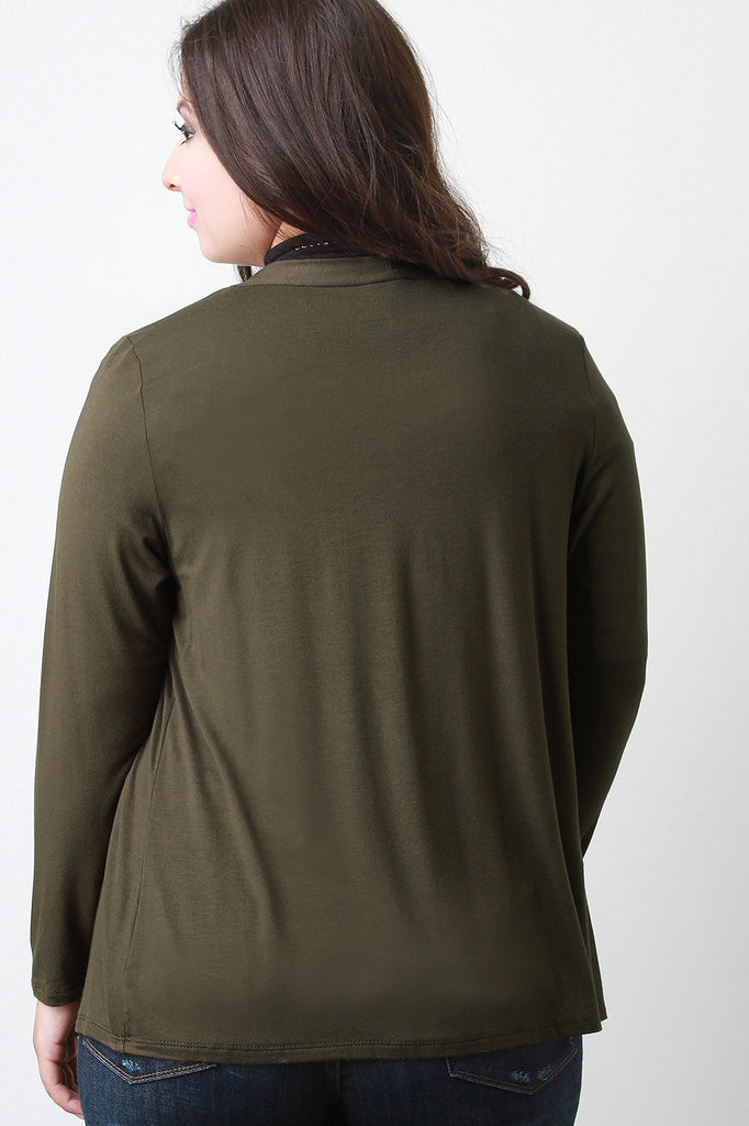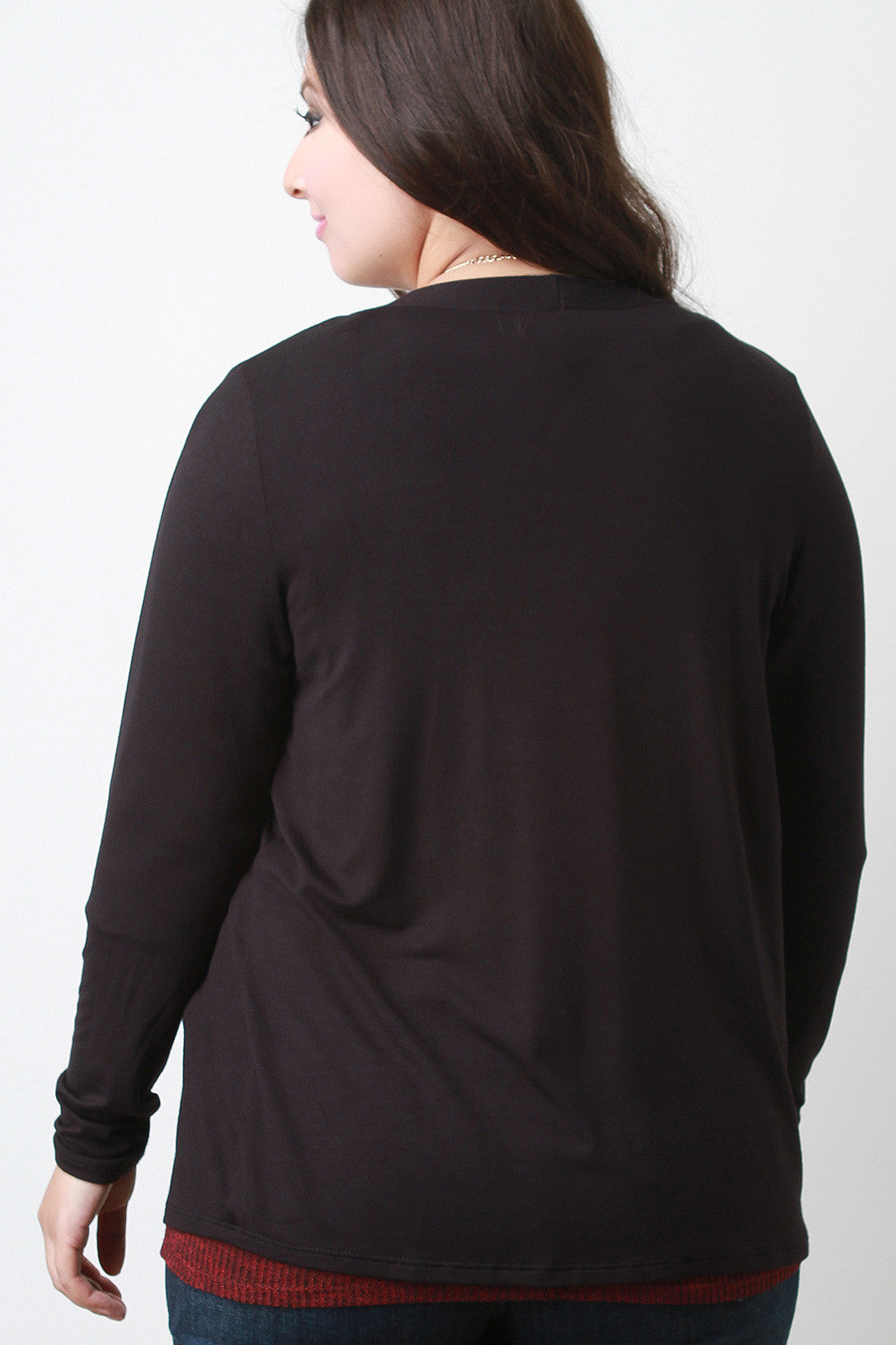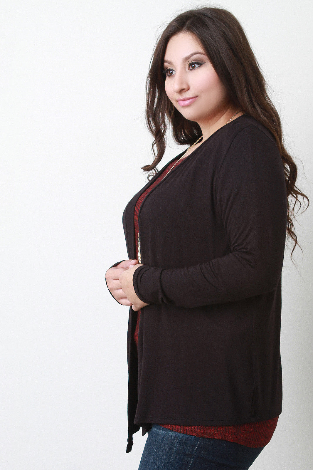 This plus size cardigan features a soft jersey knit, straight collar and open front, and full sleeves. Accessories sold separately. 97% Rayon, 3% Spandex.