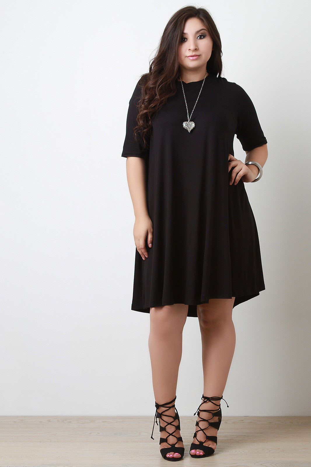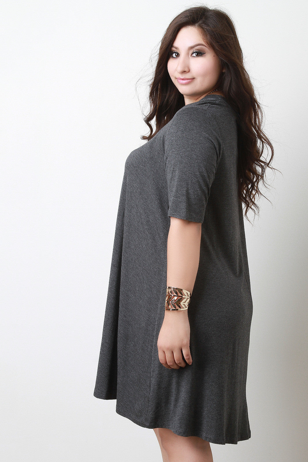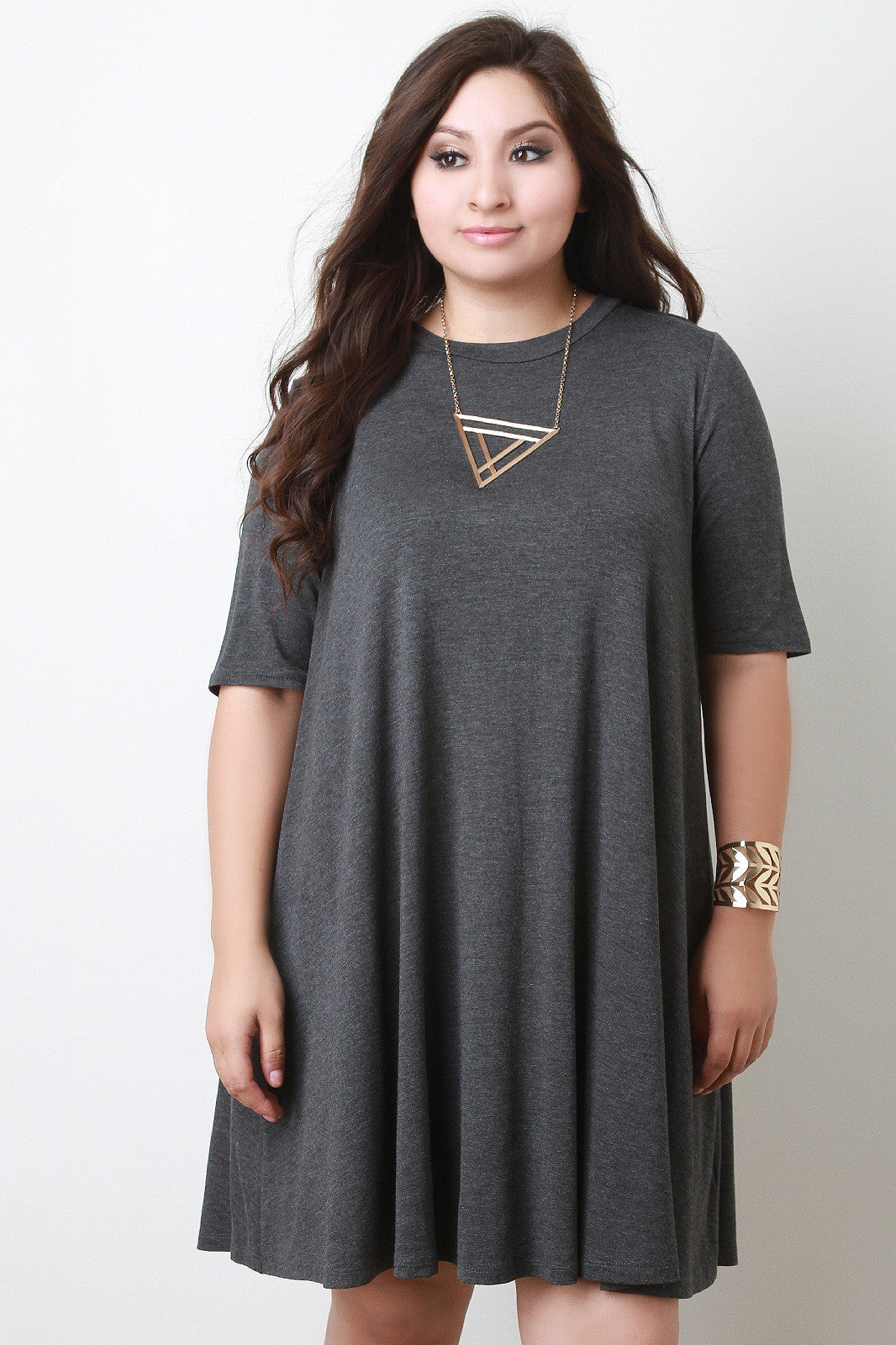 A plus size jersey shift dress featuring a crew neckline, half sleeves, and relaxed fit. Accessories sold separately. Made in U.S.A. 95% Rayon, 5% Spandex.