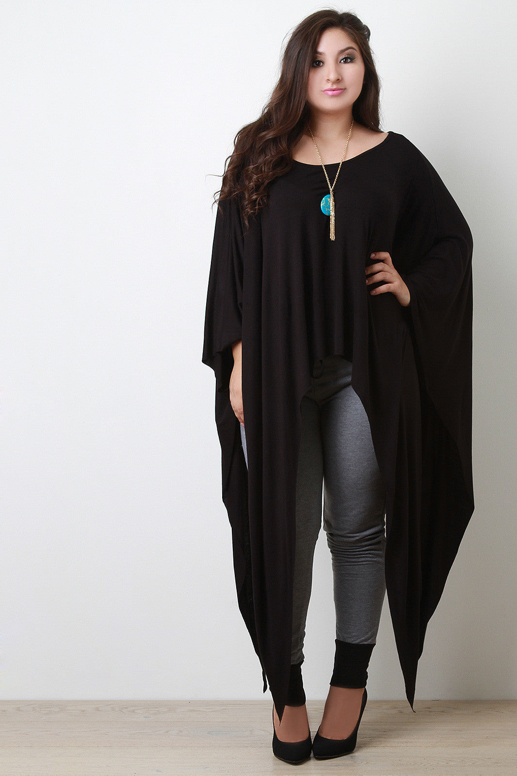 This plus size poncho top features solid color jersey knit, round neckline, and a sharkbite hemline. Unlined. Accessories sold separately. Made in U.S.A. 95% Rayon, 5% Spandex.