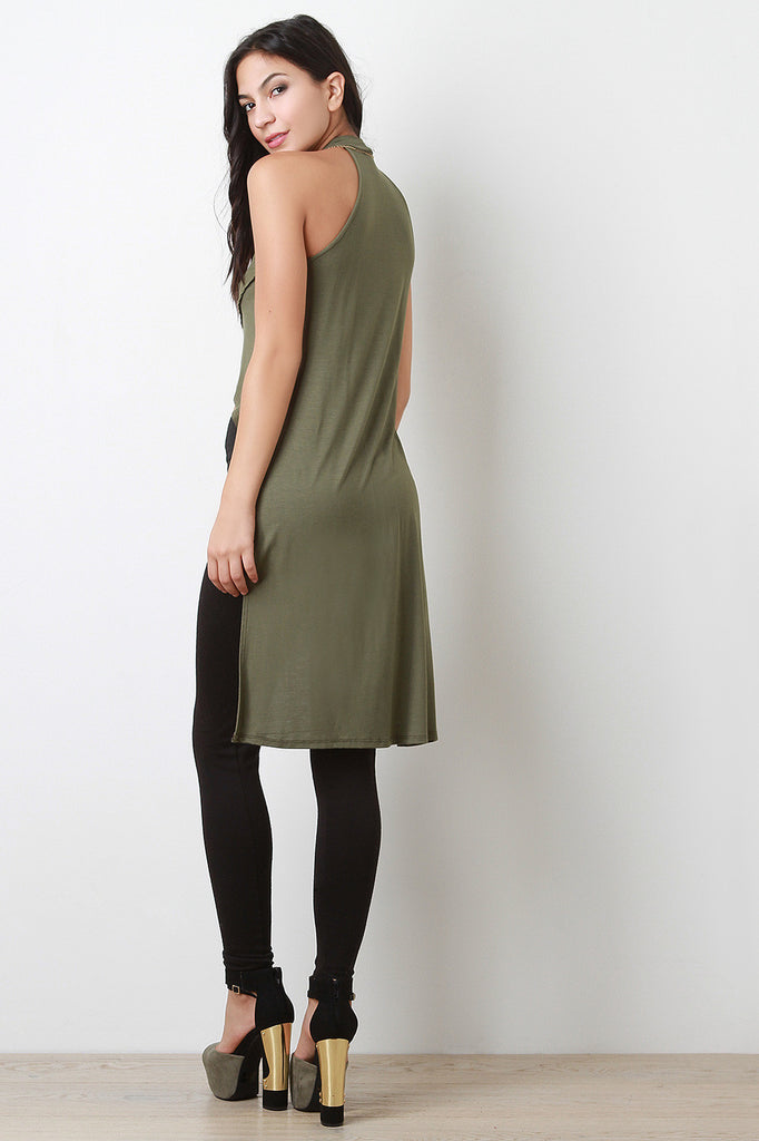 This jersey knit top features a mock neckline, sleeveless cutaway design, racerback, and a diagonal envelope crop high low hemline. Accessories sold separately. Made in U.S.A. 95% Rayon, 5% Spandex.