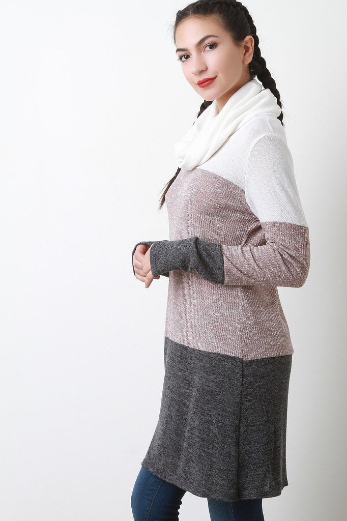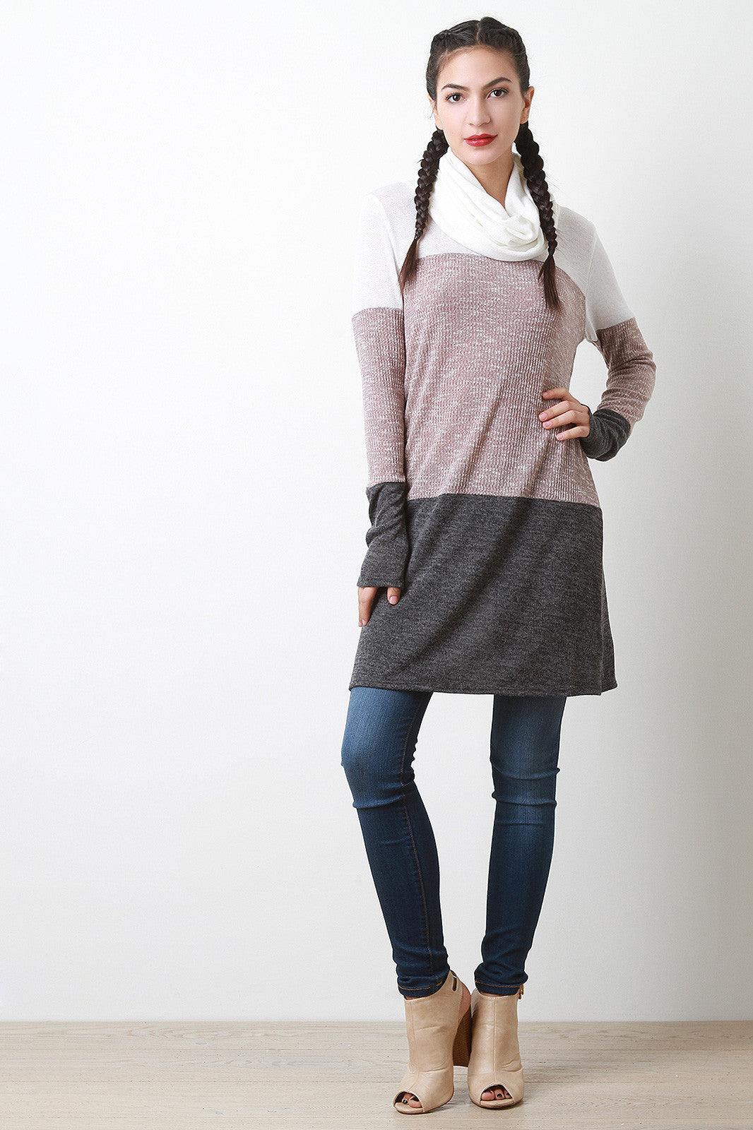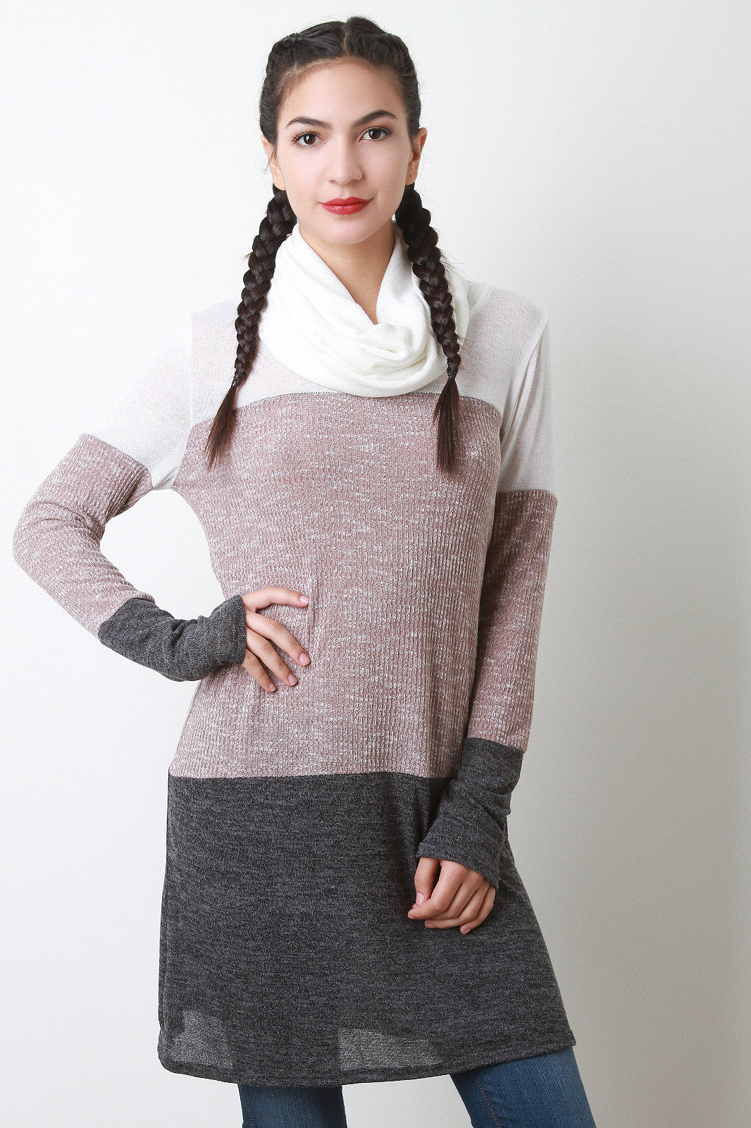 A color block sweater dress featuring semi-sheer top and bottom sections and a ridged knit center section. Also features a cowl neck, long sleeves, and a relaxed shift fit. Unlined. Accessories sold separately. Made in U.S.A. Contrast 1 and 3: 77% Polyester, 18% Rayon, 5% Spandex. Contrast 2: 96% Polyester, 4% Spandex.