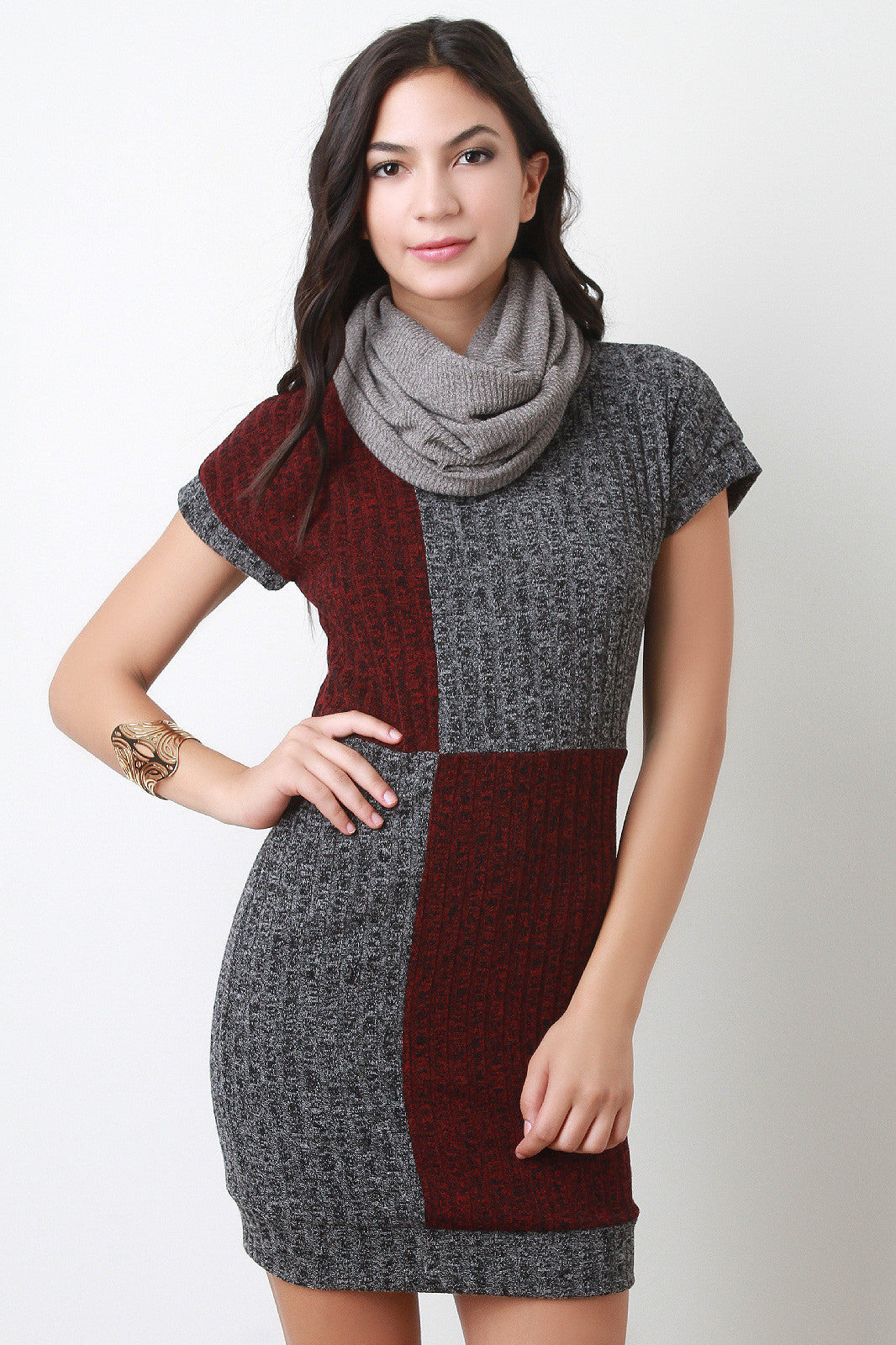 This sweater dress features a ribbed cowl neck, contrast color checker design, short sleeves, and body-hugging fit. Finished with cuffed hems. Accessories sold separately. Made in U.S.A. Self: 96% Polyester, 4% Spandex. Contrast: 65% Polyester, 31% Rayon, 4% Spandex.