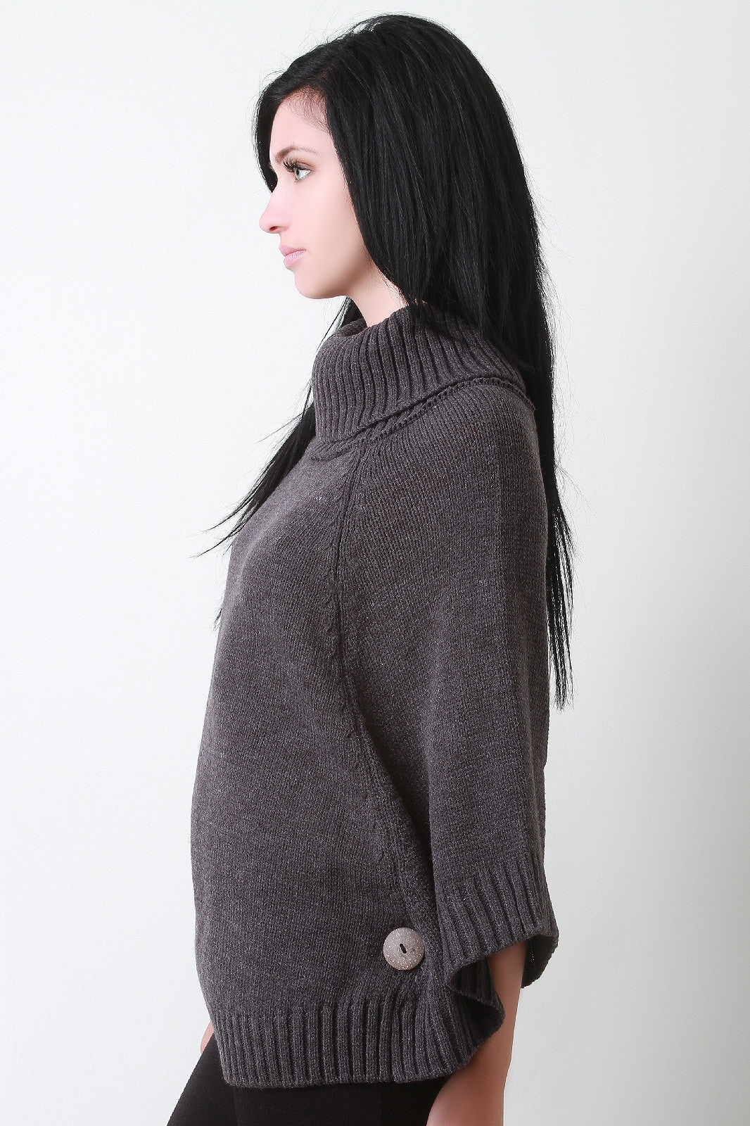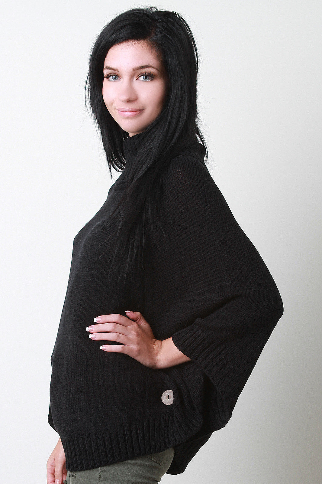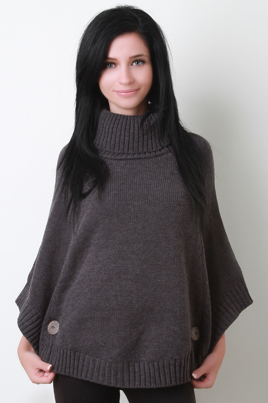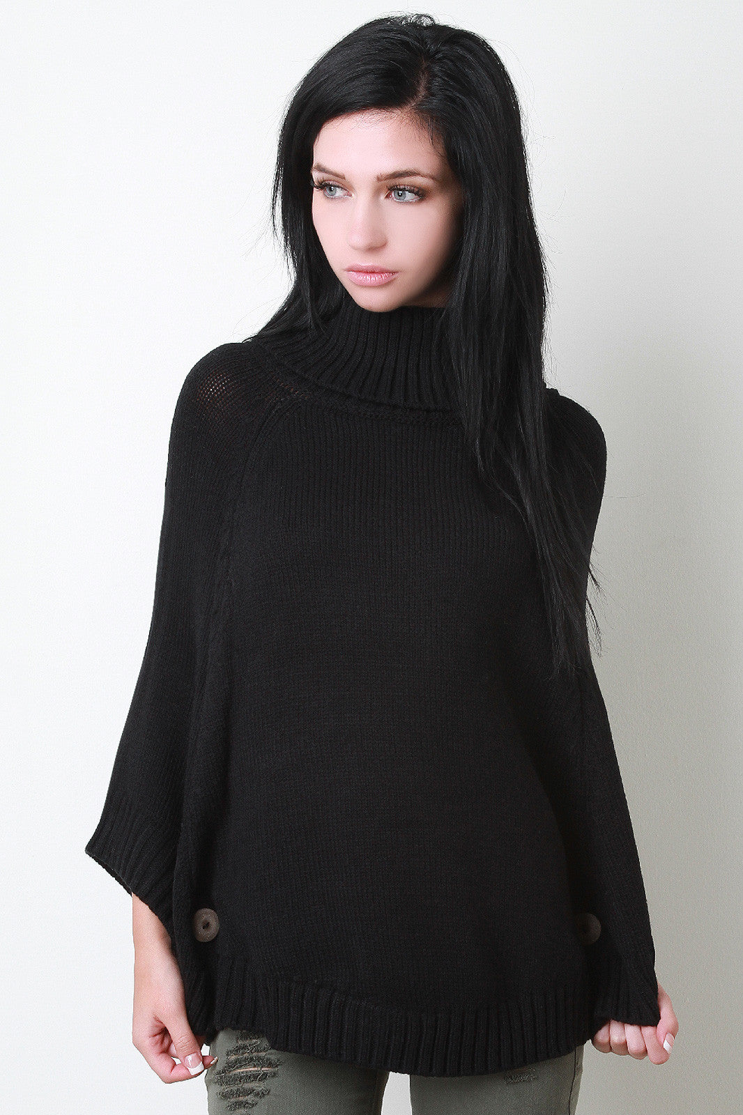 This lovely poncho features a turtleneck, bottom opening with button accent sleeves, and rounded hemline. Accessories sold separately. 100% Acrylic.