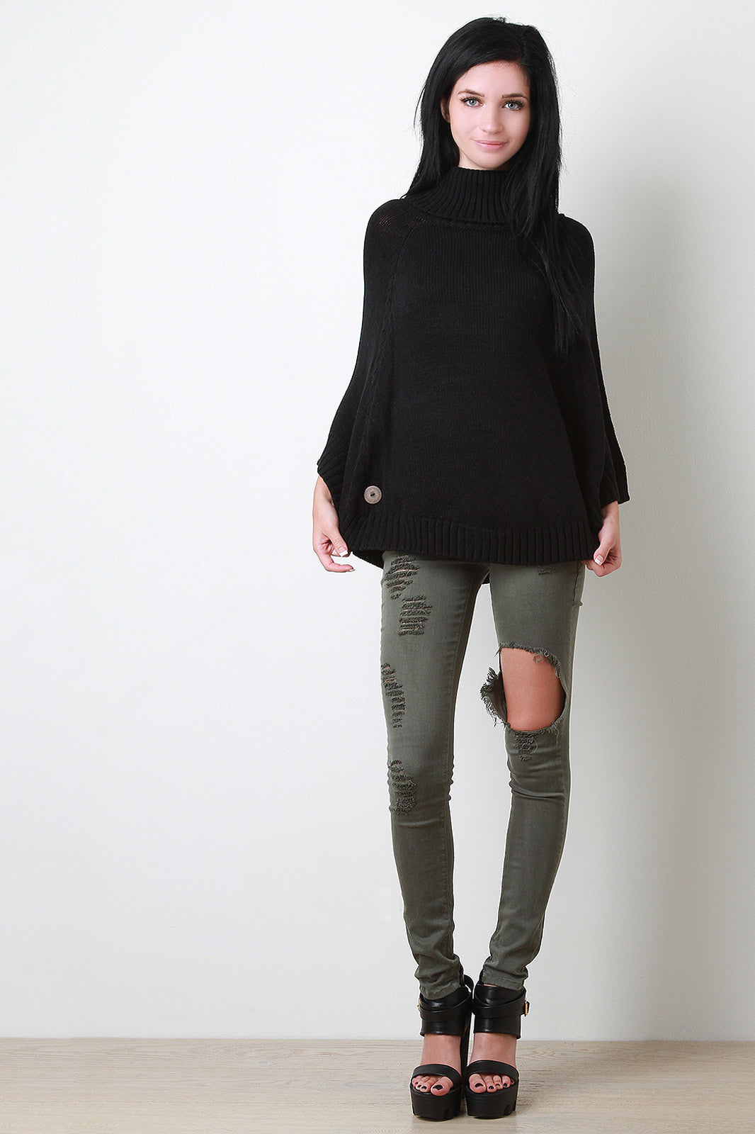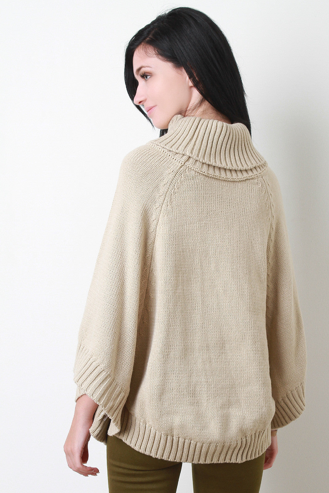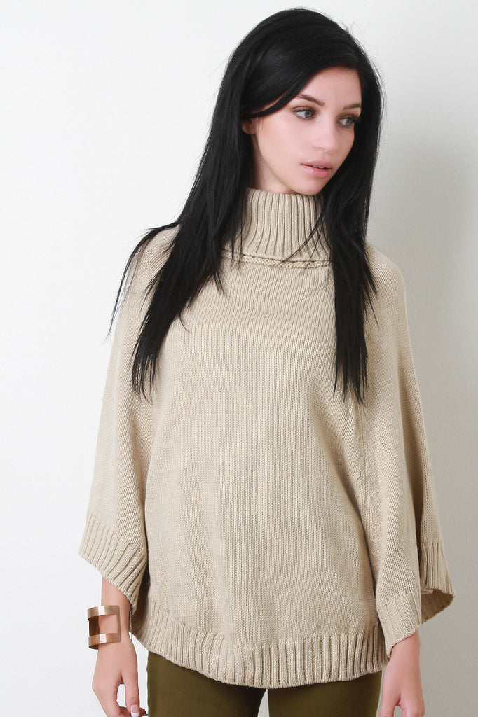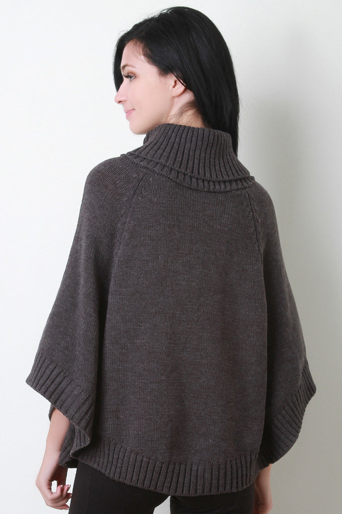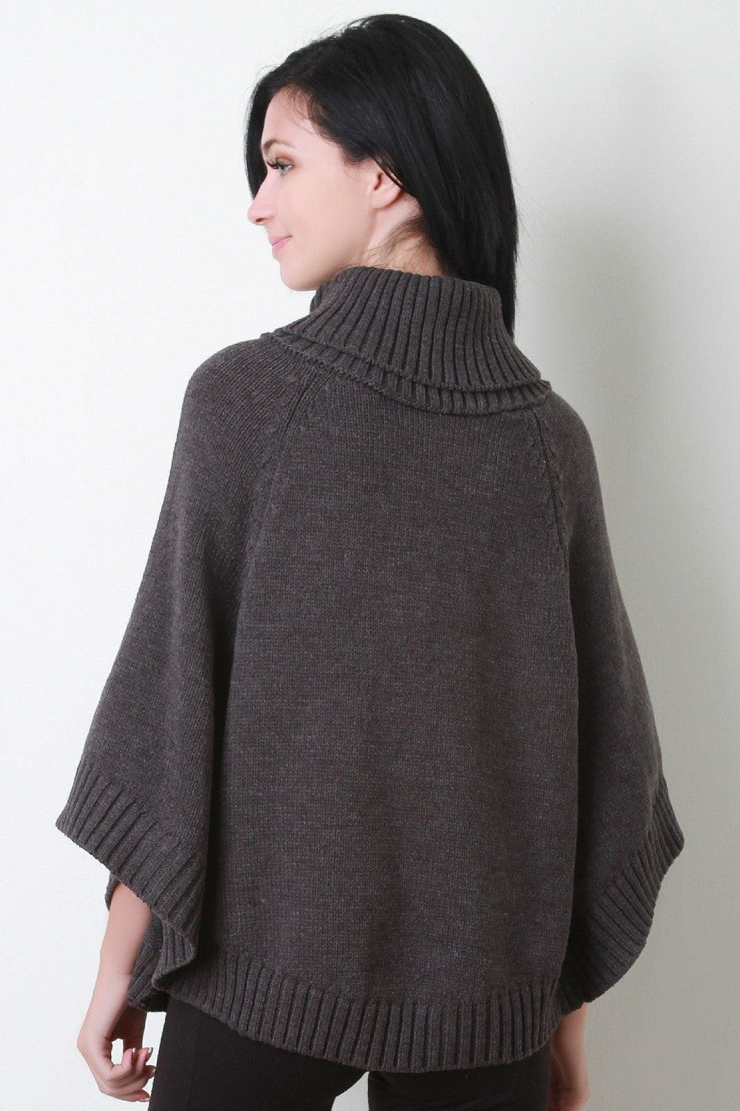 This lovely poncho features a turtleneck, bottom opening with button accent sleeves, and rounded hemline. Accessories sold separately. 100% Acrylic.