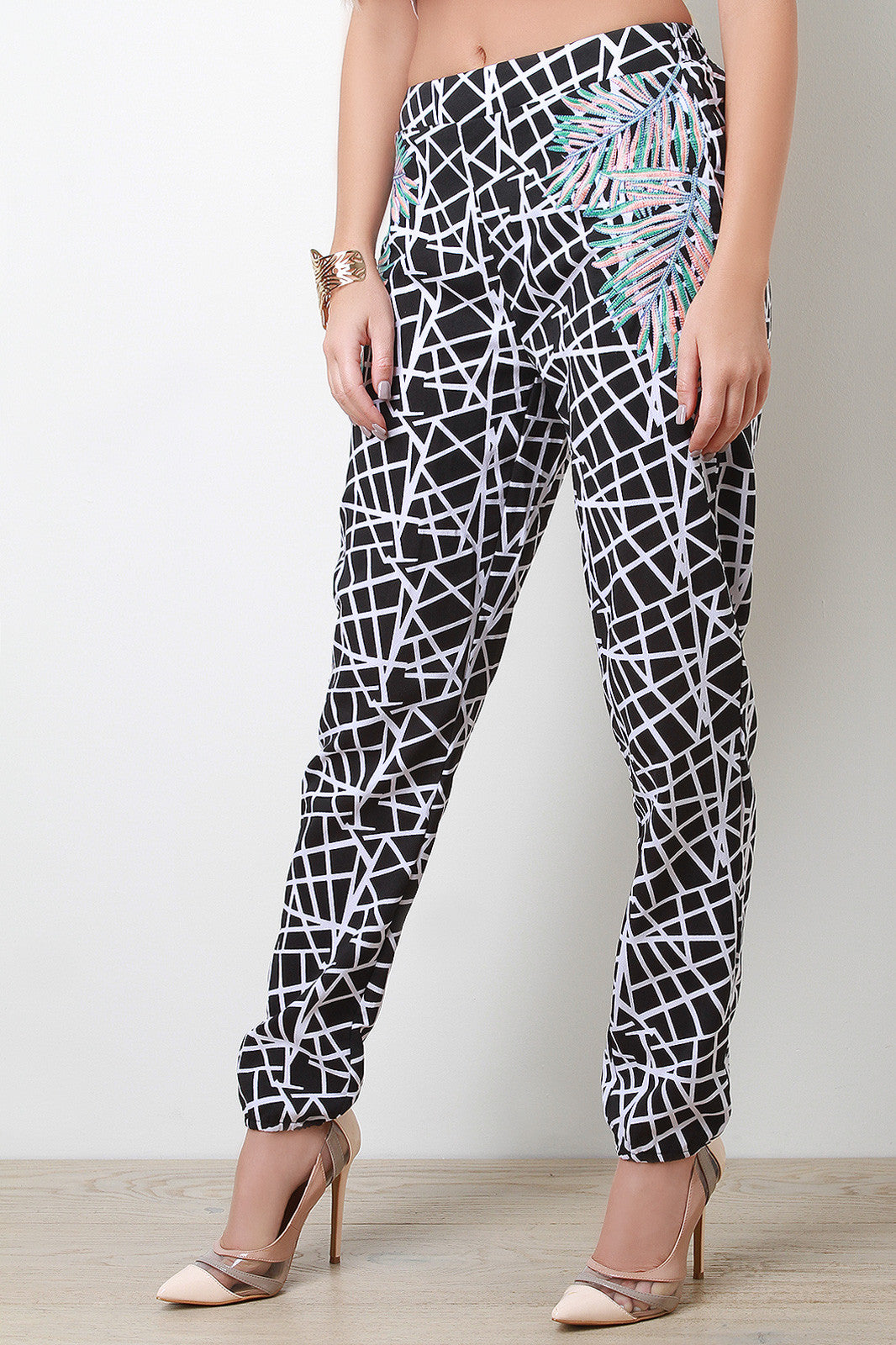 These trouser pants features contrasting graphic pattern, colorful embroidery palms at side, cinched panel waist with an elasticized back, and taper cut legs. Accessories sold separately. 100% Polyester.