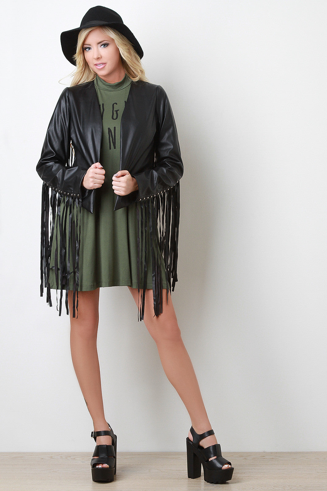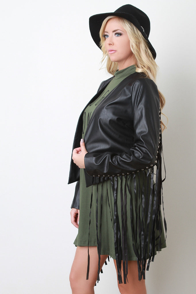 This vegan leather jacket features an open front, asymmetrical hemline, long sleeves with silver-tone studs and long fringes. Fully lined. Accessories sold separately. 100% PU. Lining: 100% Polyester.