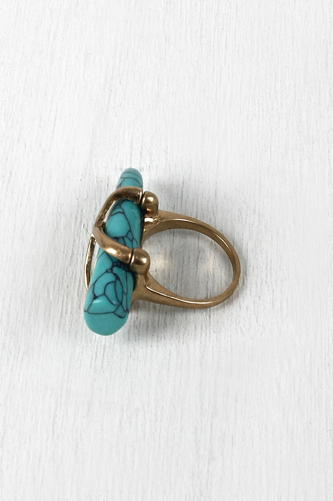 This boho-style ring features a faux turquoise fang-shaped stone and a matte metallic cross design. Ring is non-adjustable.