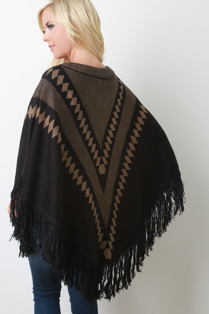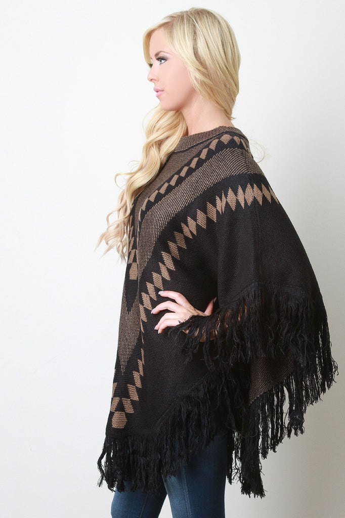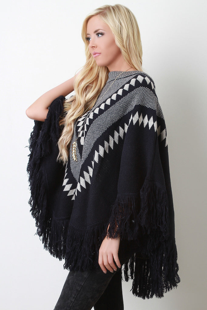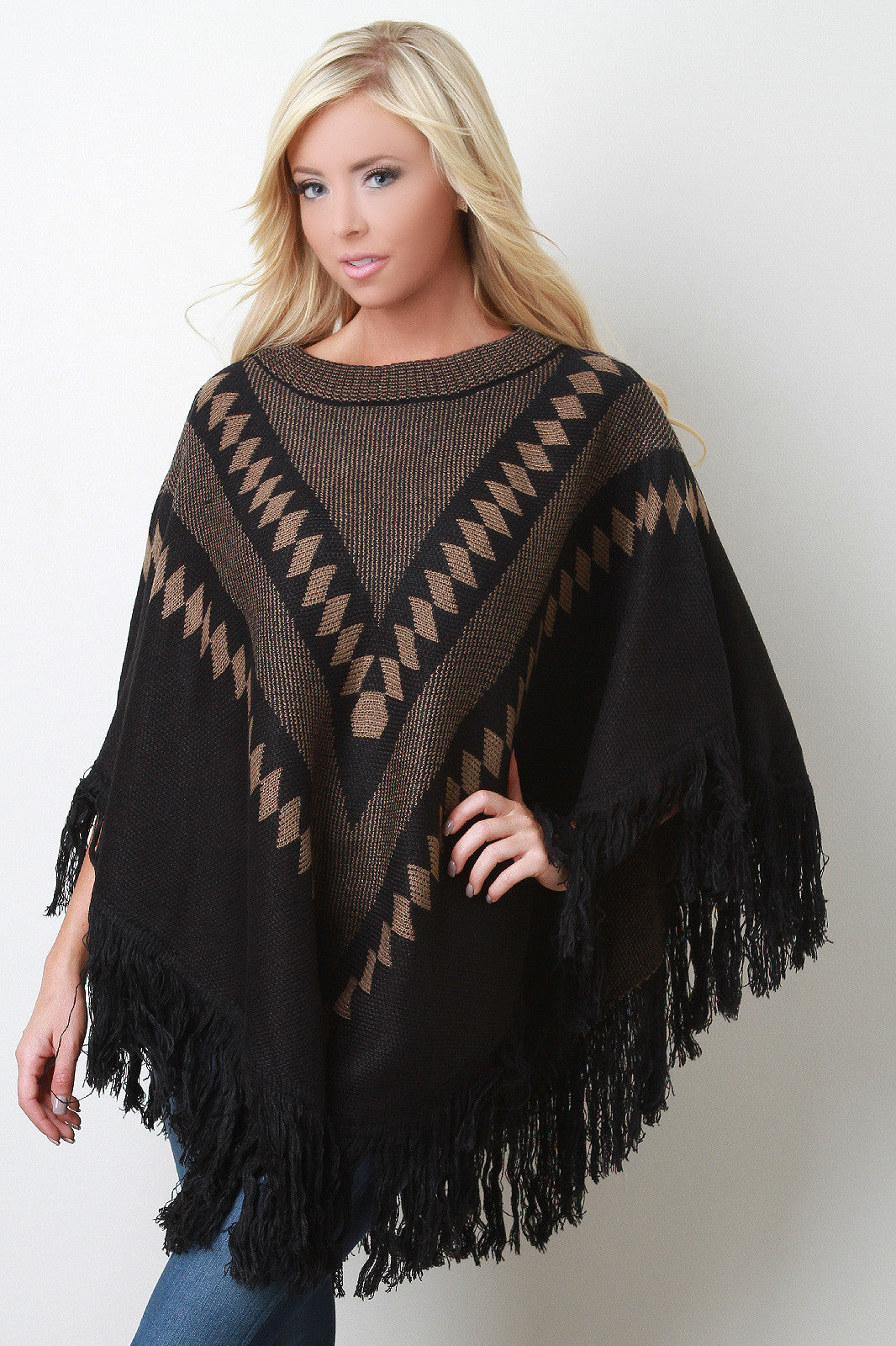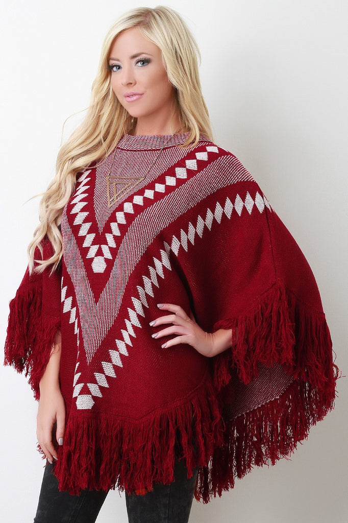 This cozy poncho features a crew neckline, pullover styling, soft patterned print knit fabrication throughout, and asymmetrical fringe hemline. Accessories sold separately. 100% Acrylic.