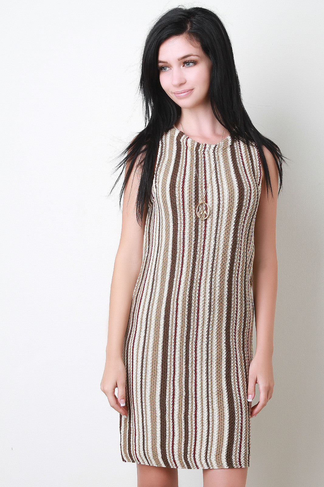 This vintage inspired sleeveless dress features a high round neckline, vertical knitted stripe design, and a casual stretchy fit. Accessories sold separately. 60% Cotton, 35% Acrylic, 5% Polyester.