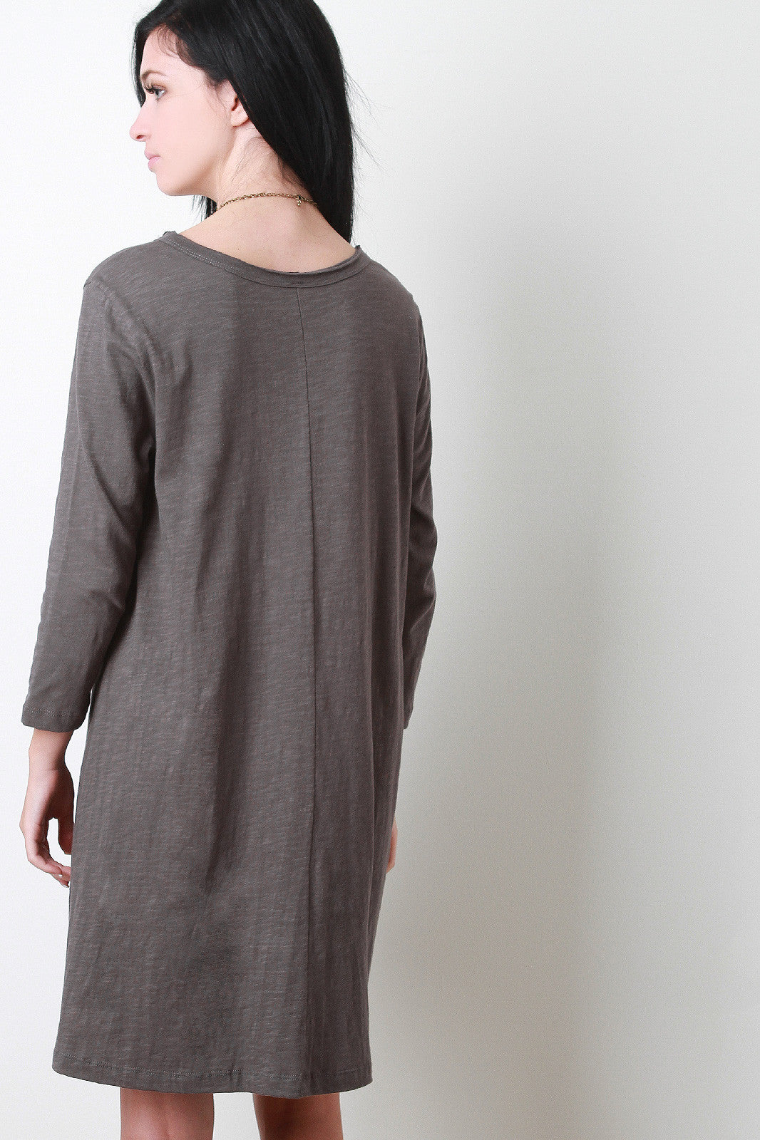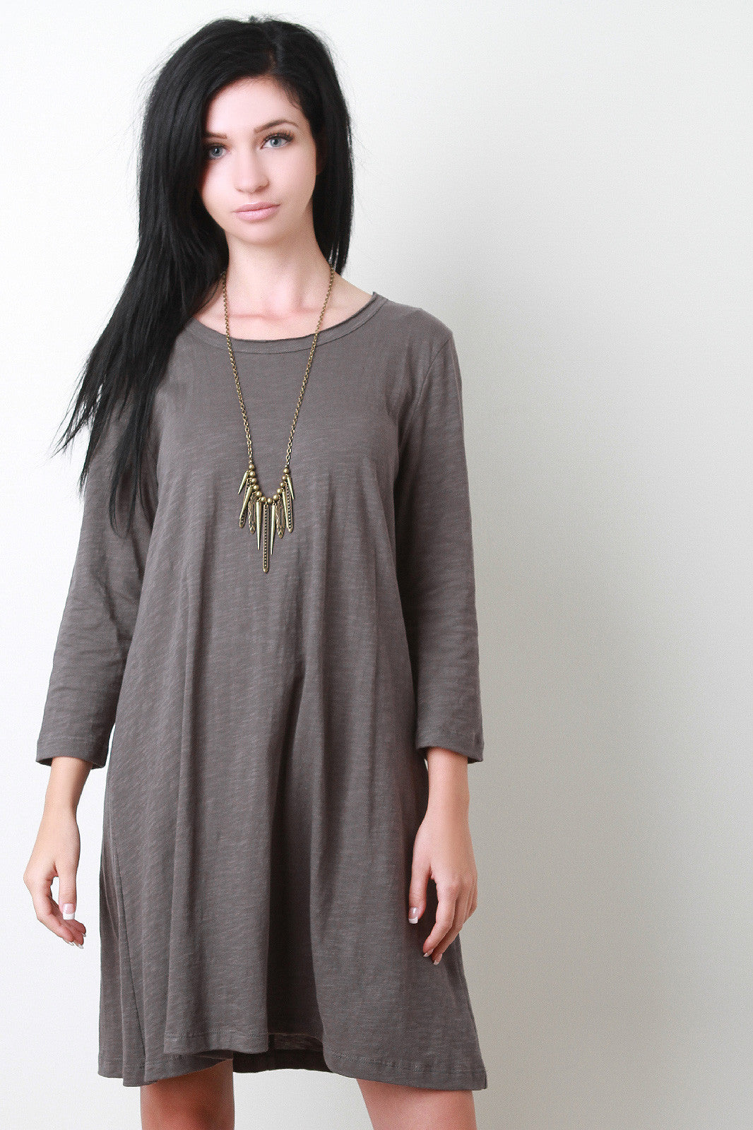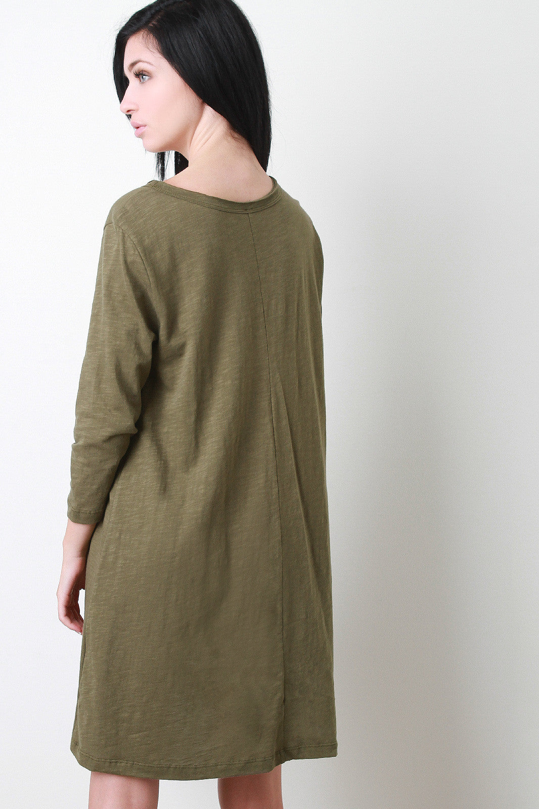 This jersey knit tunic dress features a distress round neckline, quarter-length sleeves, and a shift cut fit. Accessories sold separately. Made in U.S.A. 100% Cotton.