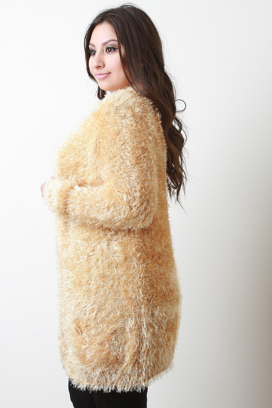 This plush plus size cardigan features fuzzy texture fabrication, open front, long sleeves, and front pockets. Accessories sold separately. 100% Polyester.